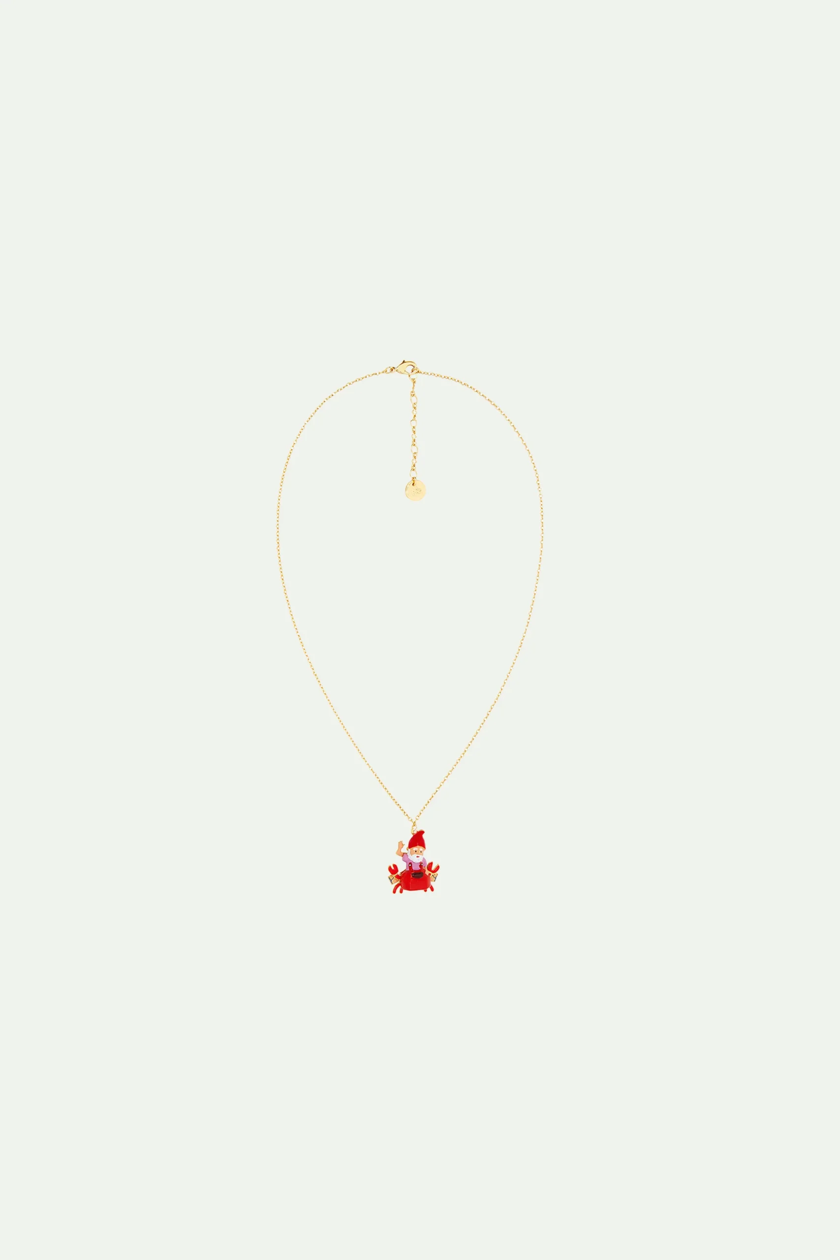 Collier pendentif, nain de jardin sur le dos de son ami le crabe, personnages peints à la main, chaîne dorée à l’or fin.