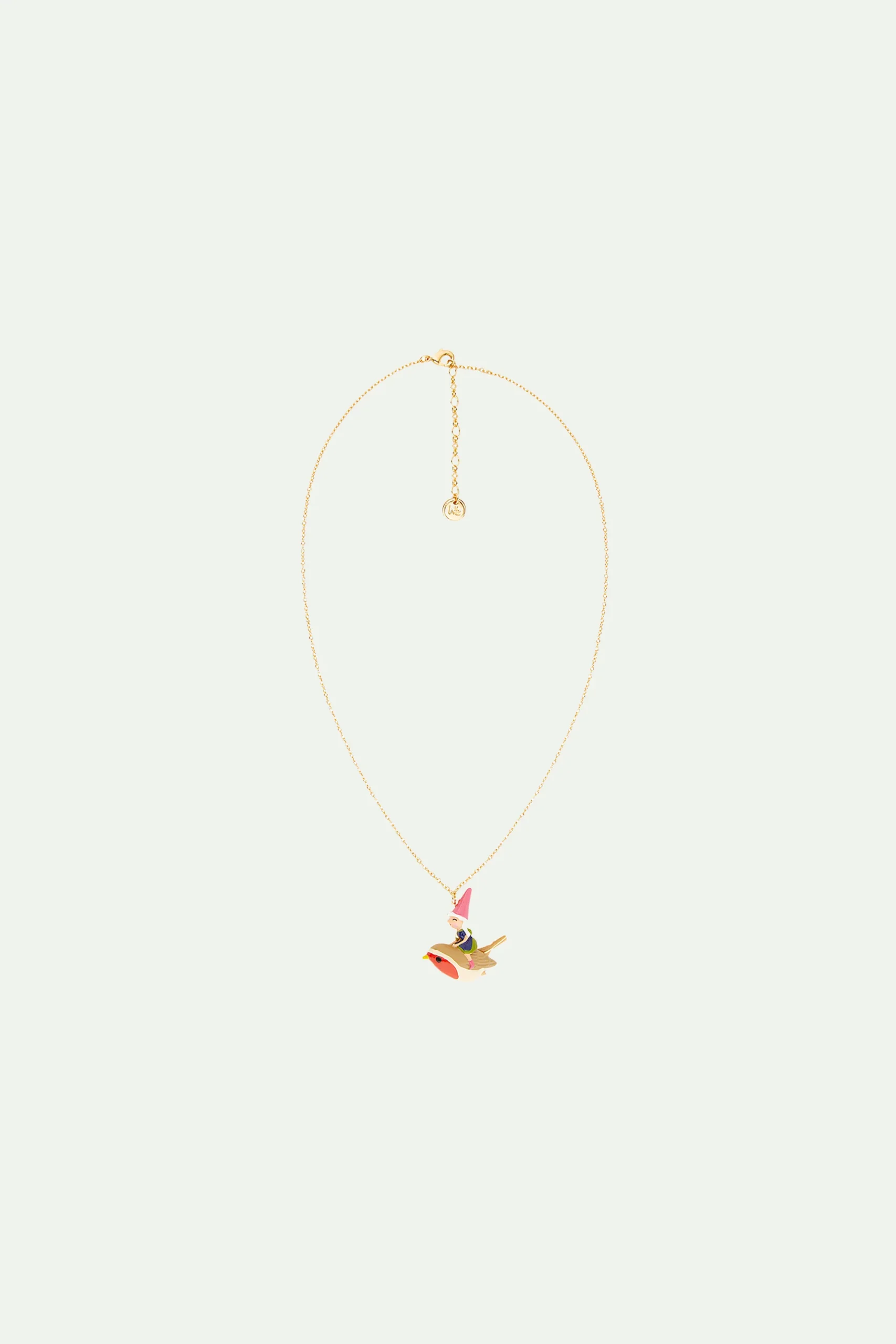 Sur ce collier pendentif haute fantaisie, la charmante naine profite d’une balade divertissante à dos d’oiseau. Assise confortablement sur le dos d’un rouge-gorge, elle part en escapade pour savourer le doux vent printanier par une journée ensoleillée. Ce collier plein de gaieté se mariera à ravir avec tous les autres bijoux de la collection Les Champimignon, notamment avec les boucles d’oreilles asymétriques nains de jardin et oiseaux. Collier Pendentif : laiton doré à l’or fin, peint à la main et résine.
