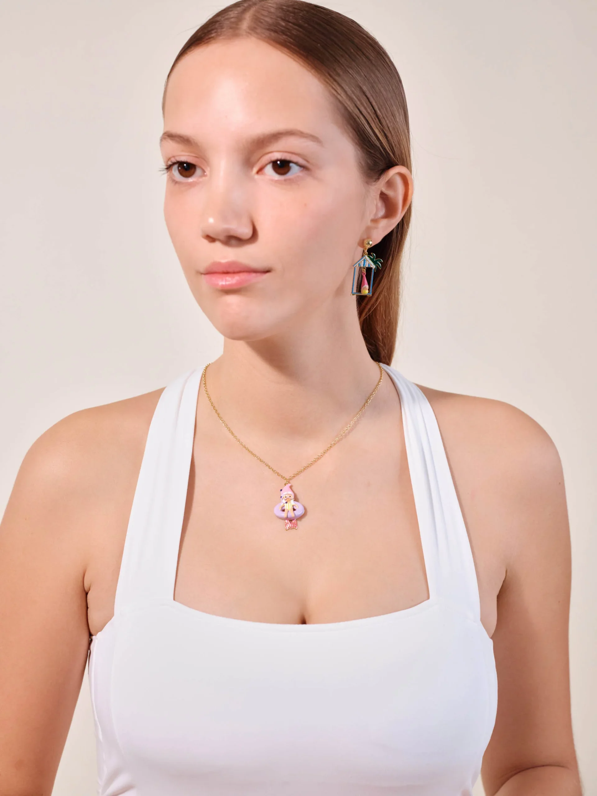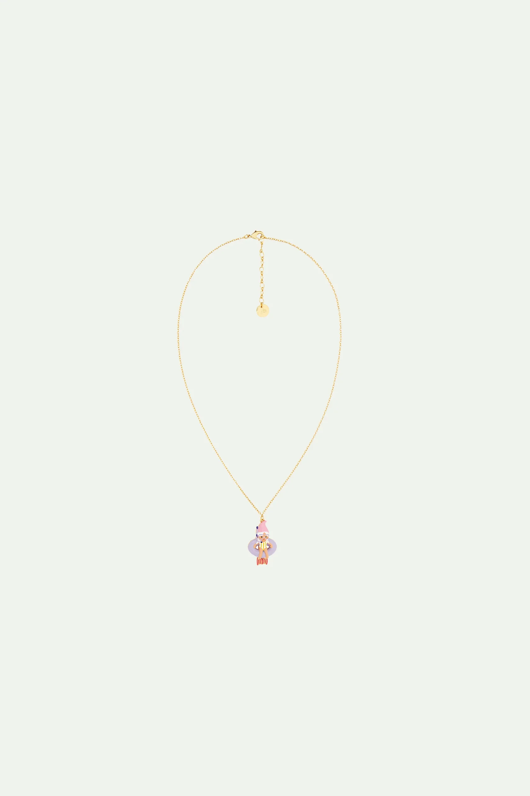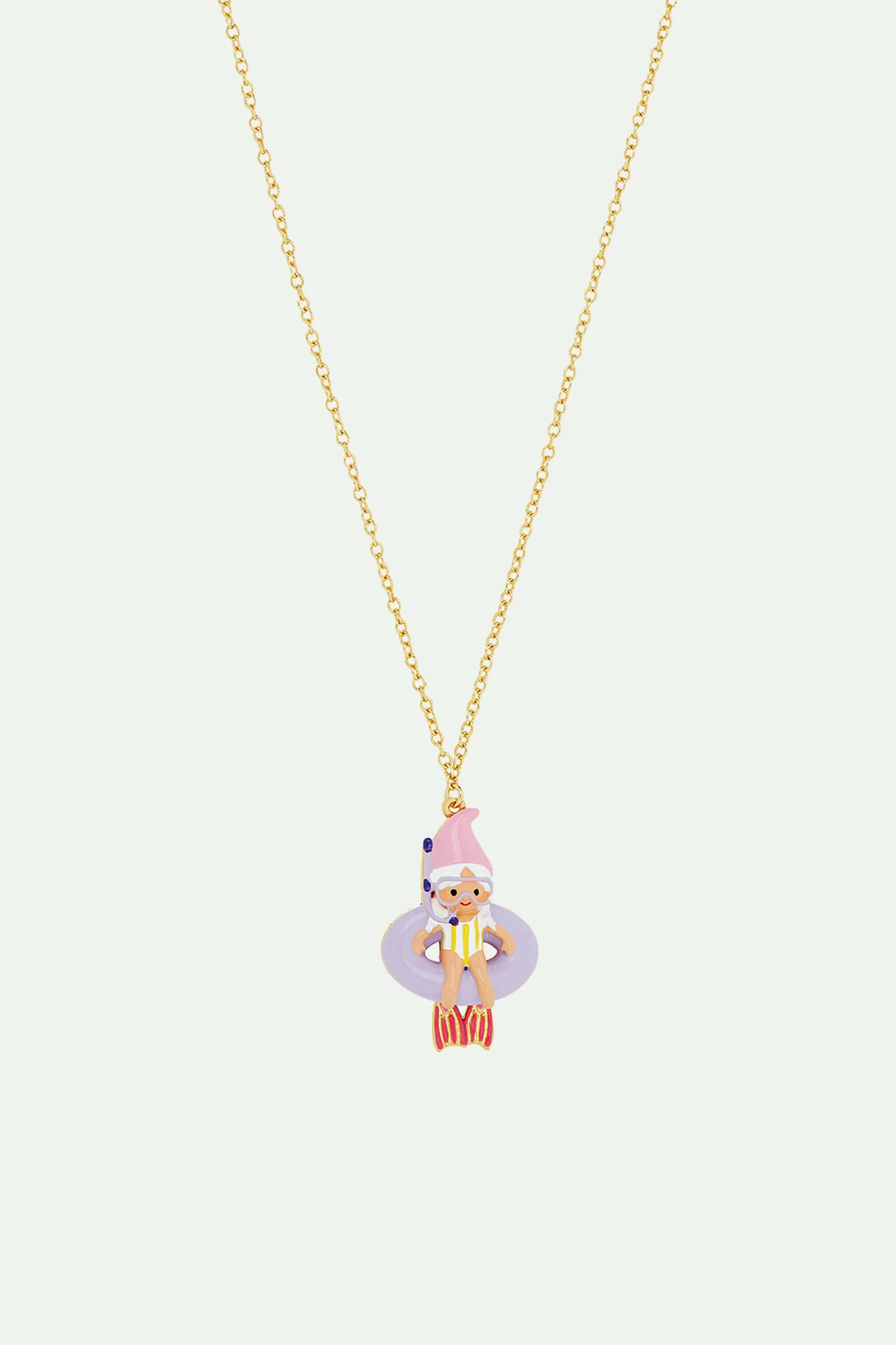 Collier pendentif, naine plongeuse sur une bouée, personnage peint à la main, chaîne en laiton doré à l’or fin.