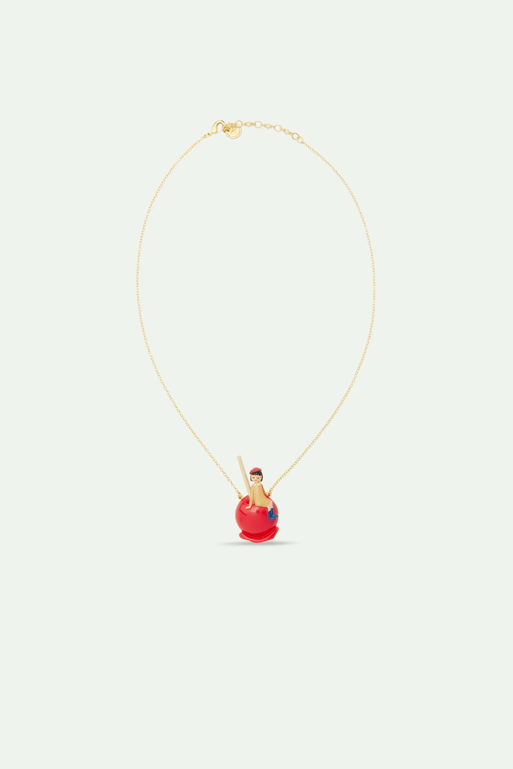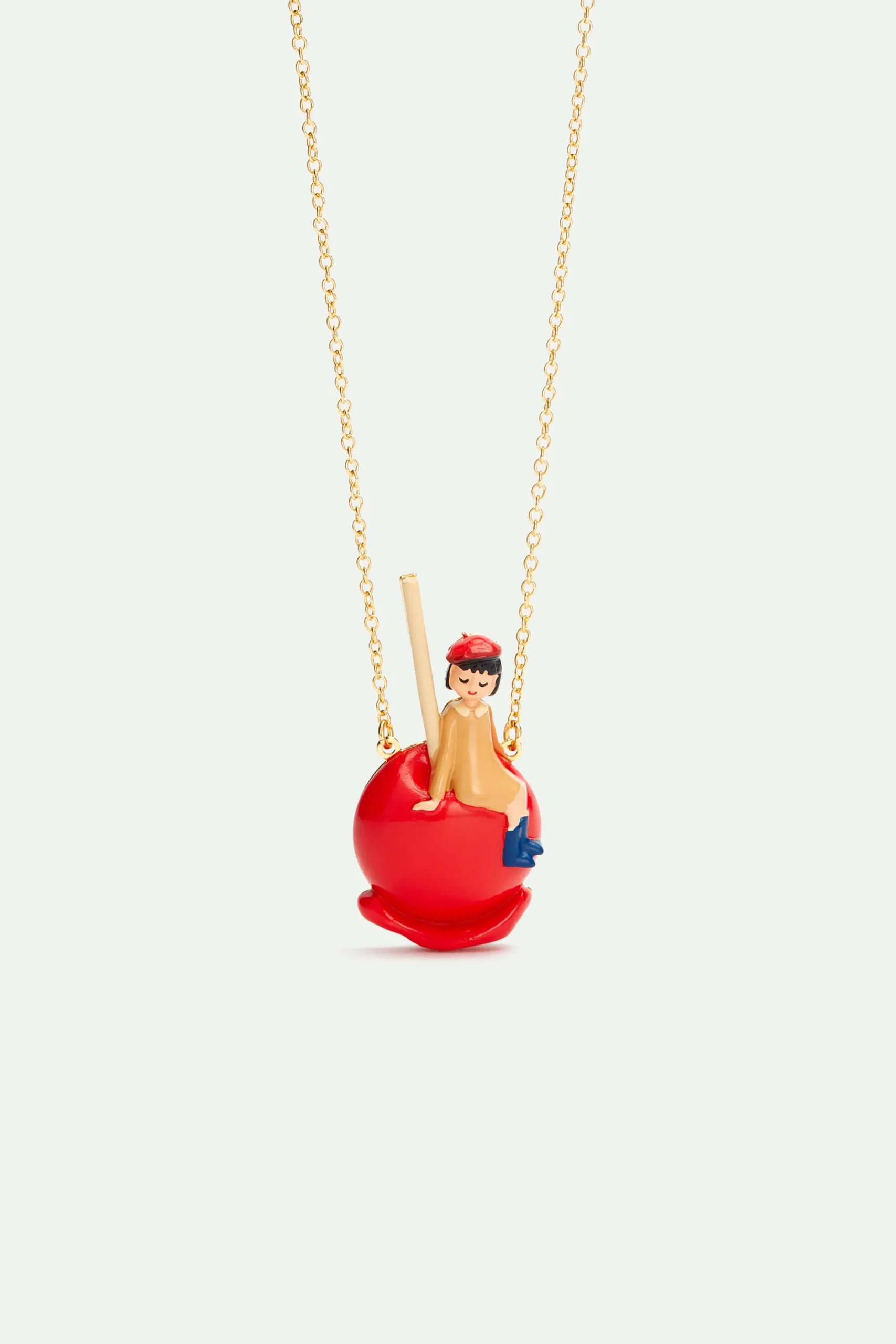 Collier pendentif présentant une petite fille habillée d’un béret rouge et d’une robe jaune assise sur une pomme d’amour géante. Lors de ce qu’on pourrait imaginer être un après-midi d’automne au jardin des Tuileries, une petite fille, appelons-la Madeleine, se promène avec son teckel, appelons-le Octave. D’attraction en attraction, les bijoux en résine peinte à la main nous emmènent dans le monde merveilleux des manèges, pommes d’amour, barbes à papa, et autres petits canards.
