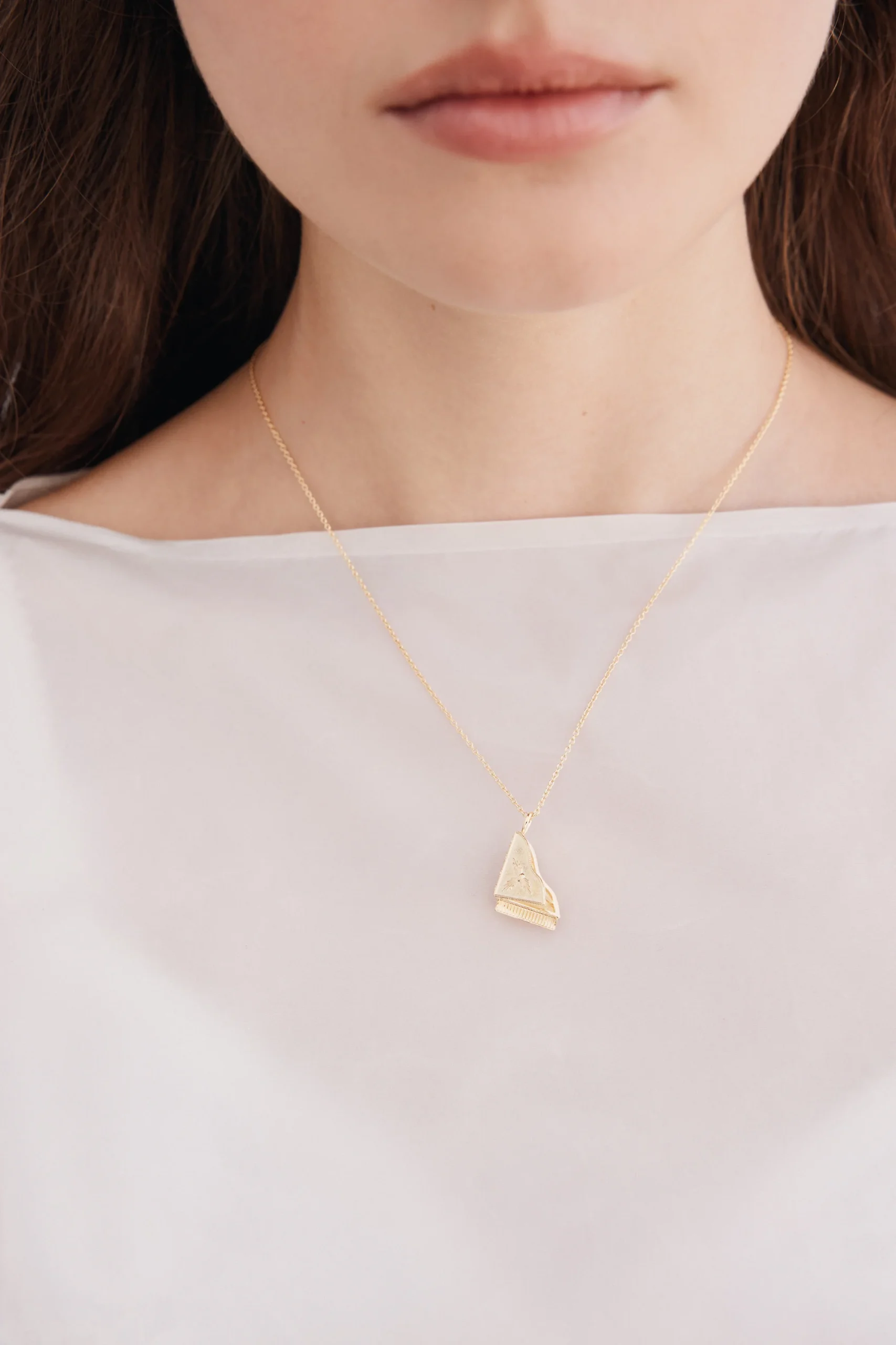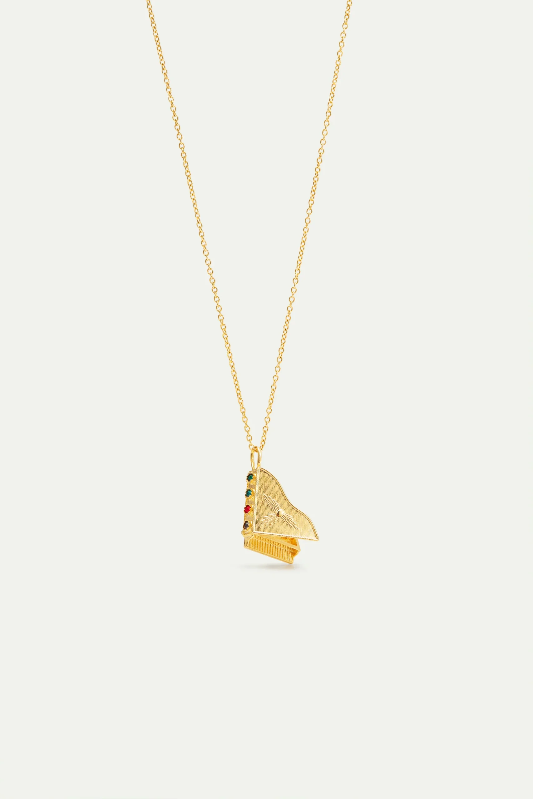 Collier fin pendentif piano à queue en laiton doré à l’or fin orné d’oxydes de zirconium multicolores.