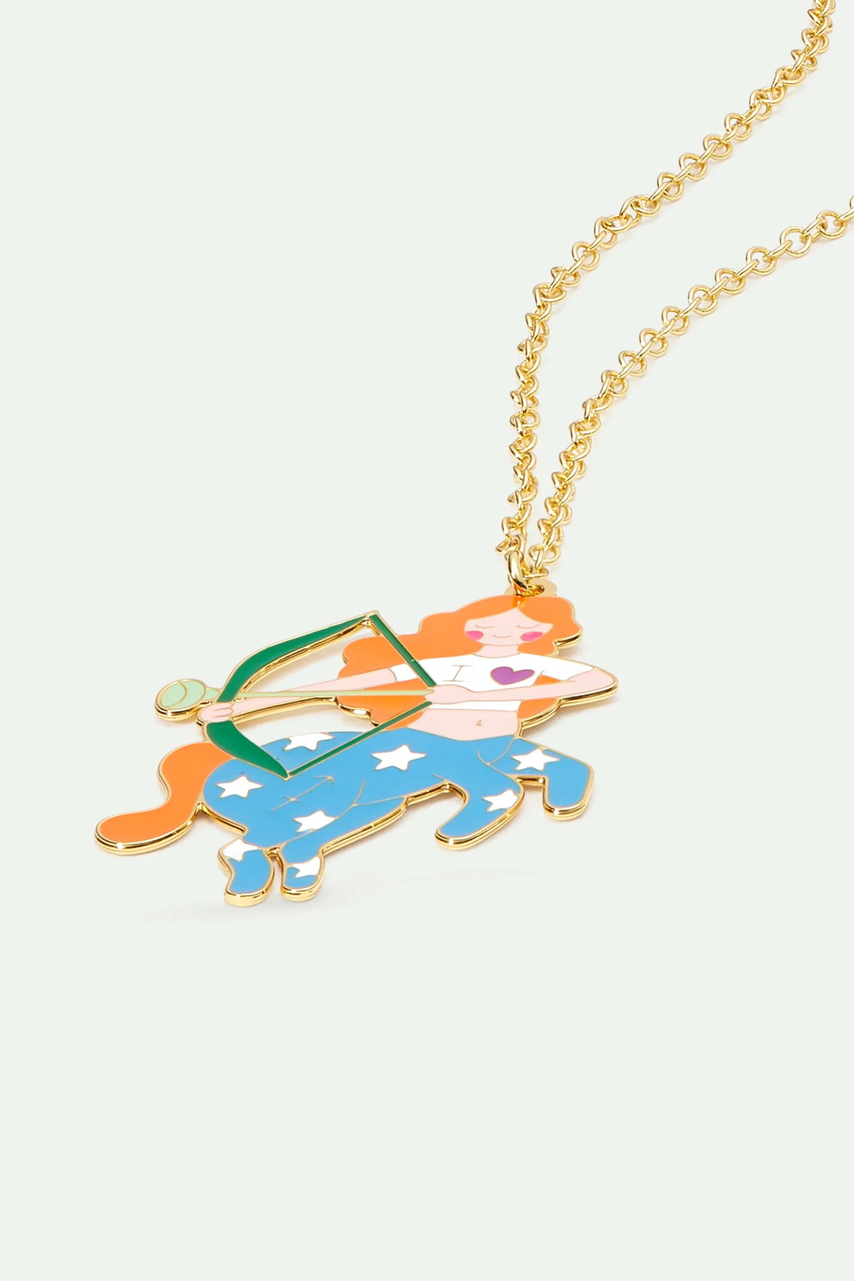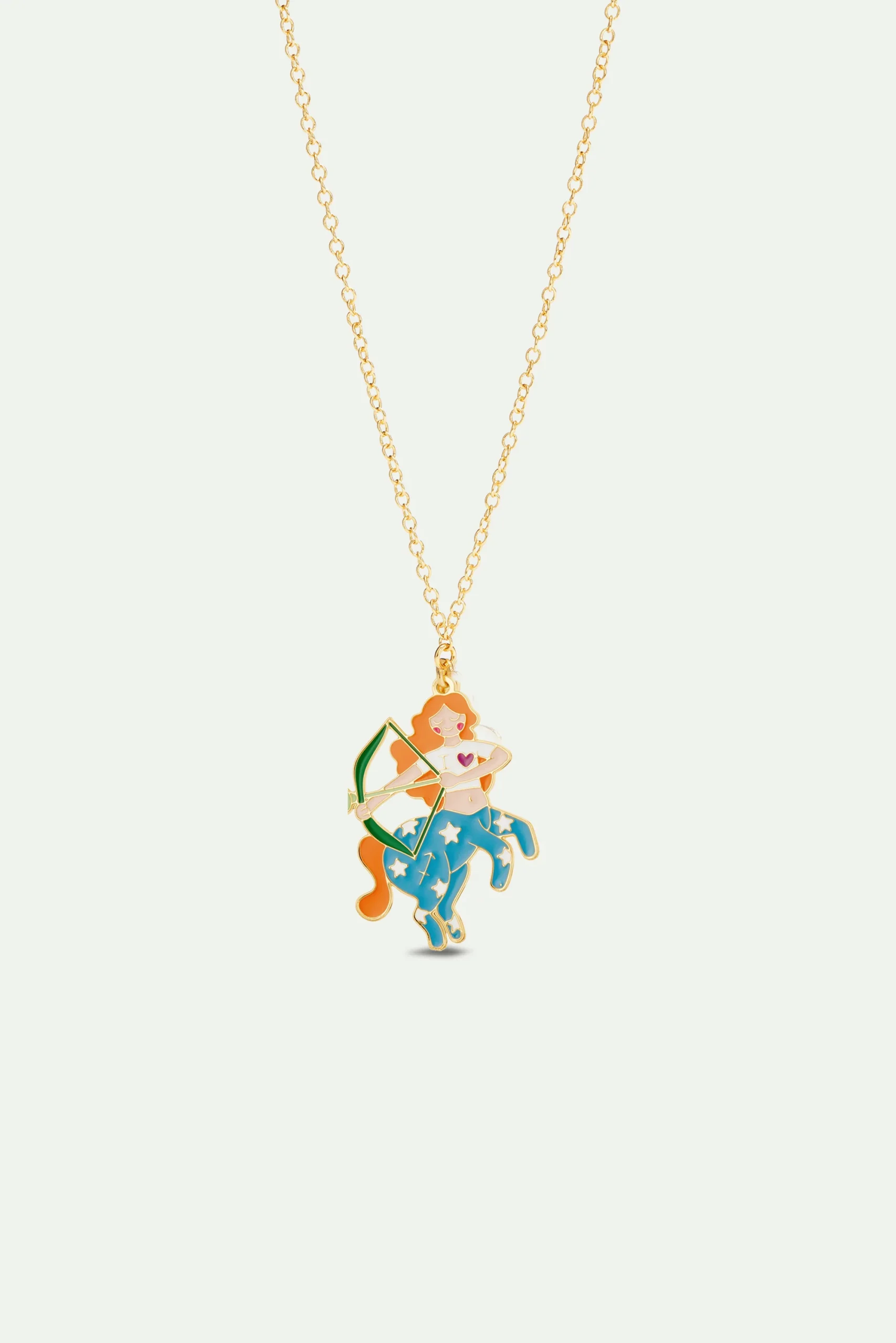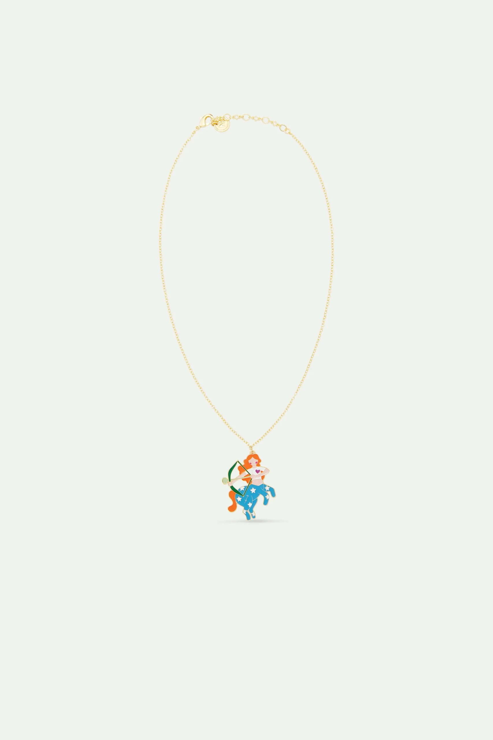 Sur ce collier pendentif est représenté le signe astrologique du sagittaire sous forme d’un centaure aux cheveux roux et aux pattes bleus et tenant un arc vert dans ses mains. Nous pouvons retrouver le signe du sagittaire sur la jambe du centaure. La thématique Astrologie, chère au cœur des Néréides, est traitée pour la première fois chez N2. Animaux et personnages aux couleurs acidulées se prêtent, à leur manière, au jeu des étoiles et du destin !