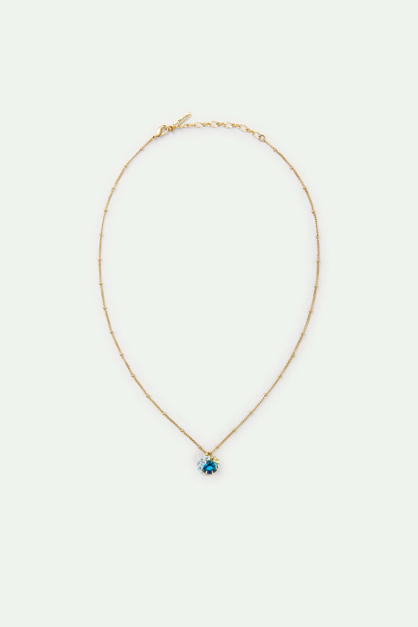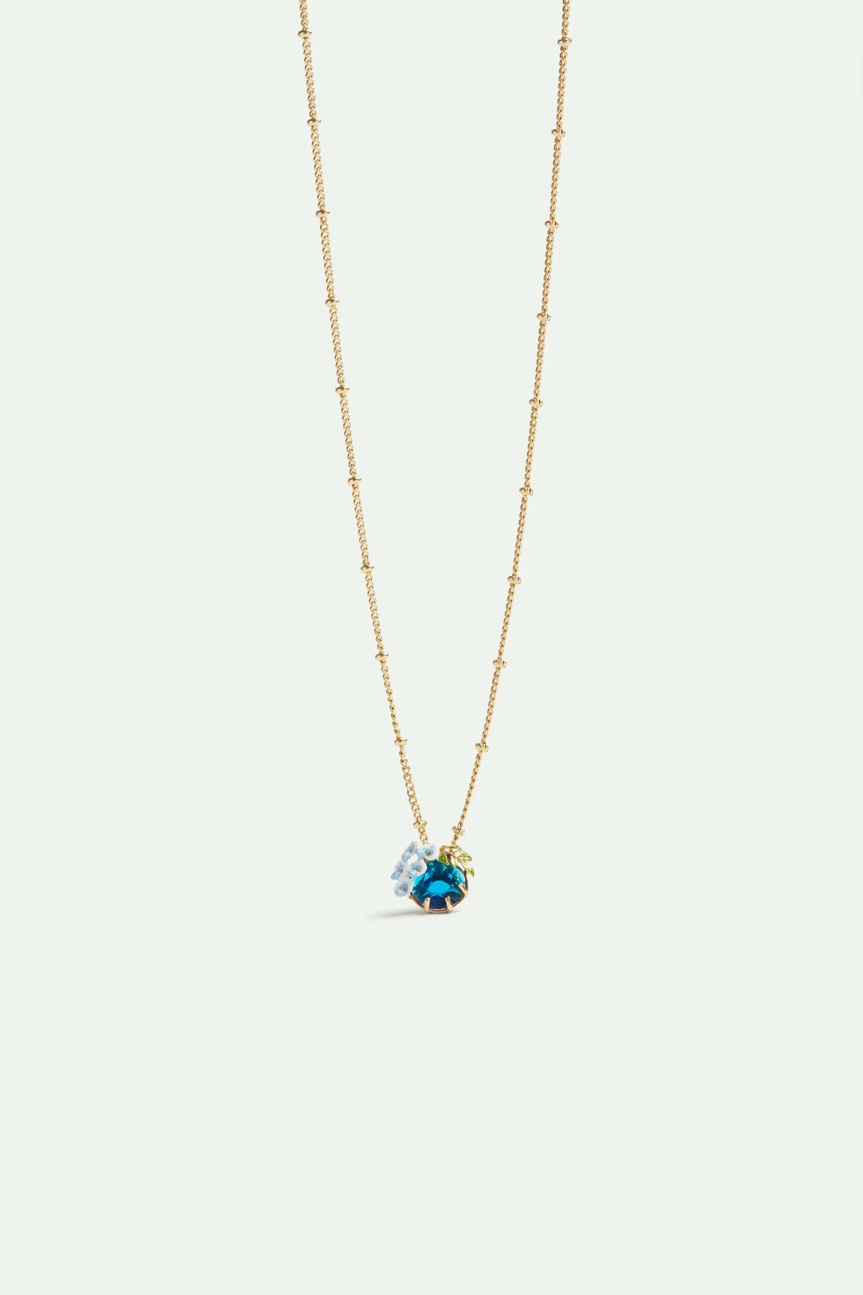 Collier pendentif composé d’une pierre en verre facettée bleue, ornée de fleurs de glycine peintes à la main. De chaque côté de la pierre se trouvent deux boutons de glycine en perles de verre facettées. Ses fleurs semblables à une nuée de papillons prennent des teintes bleutée et font les délices des abeilles.