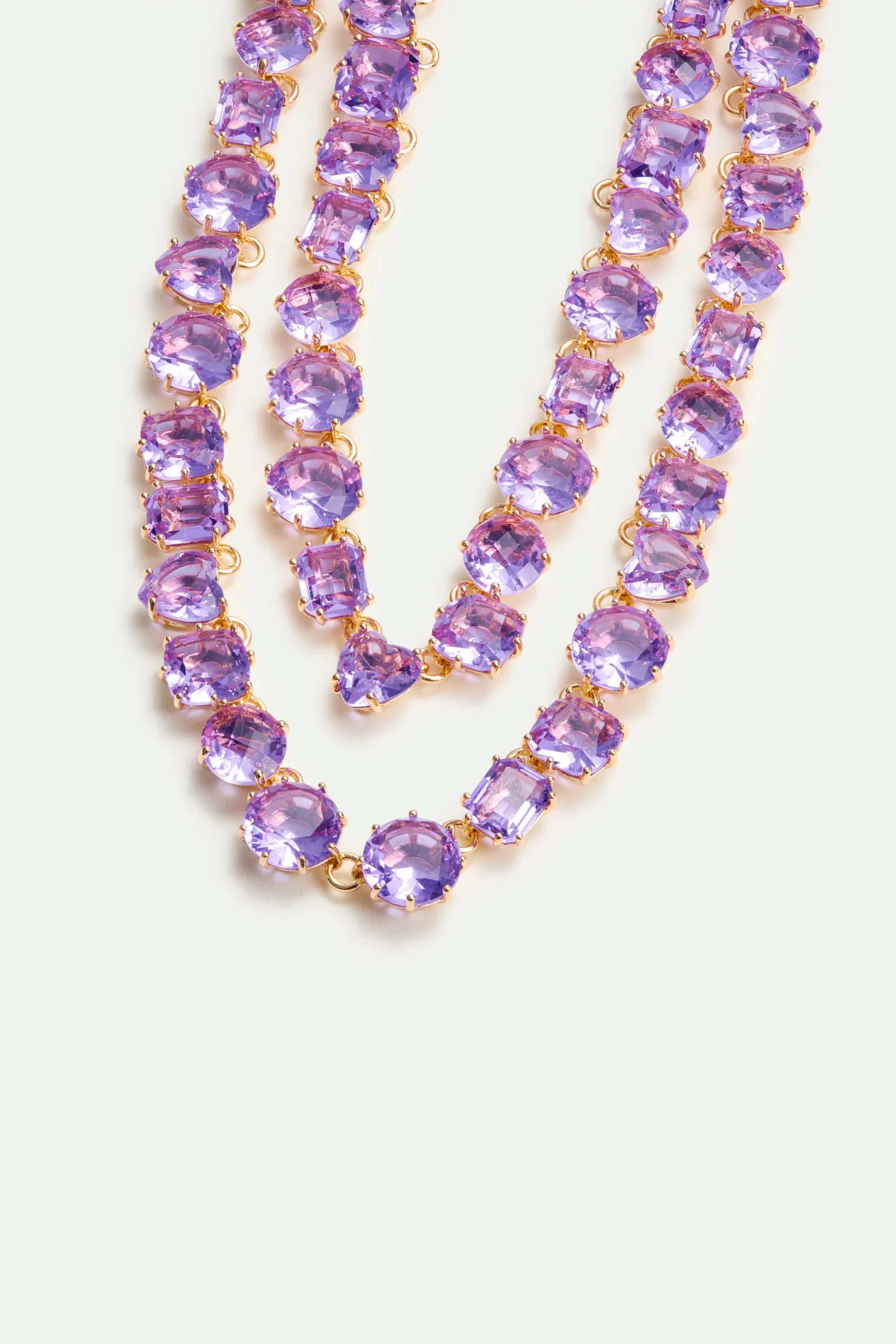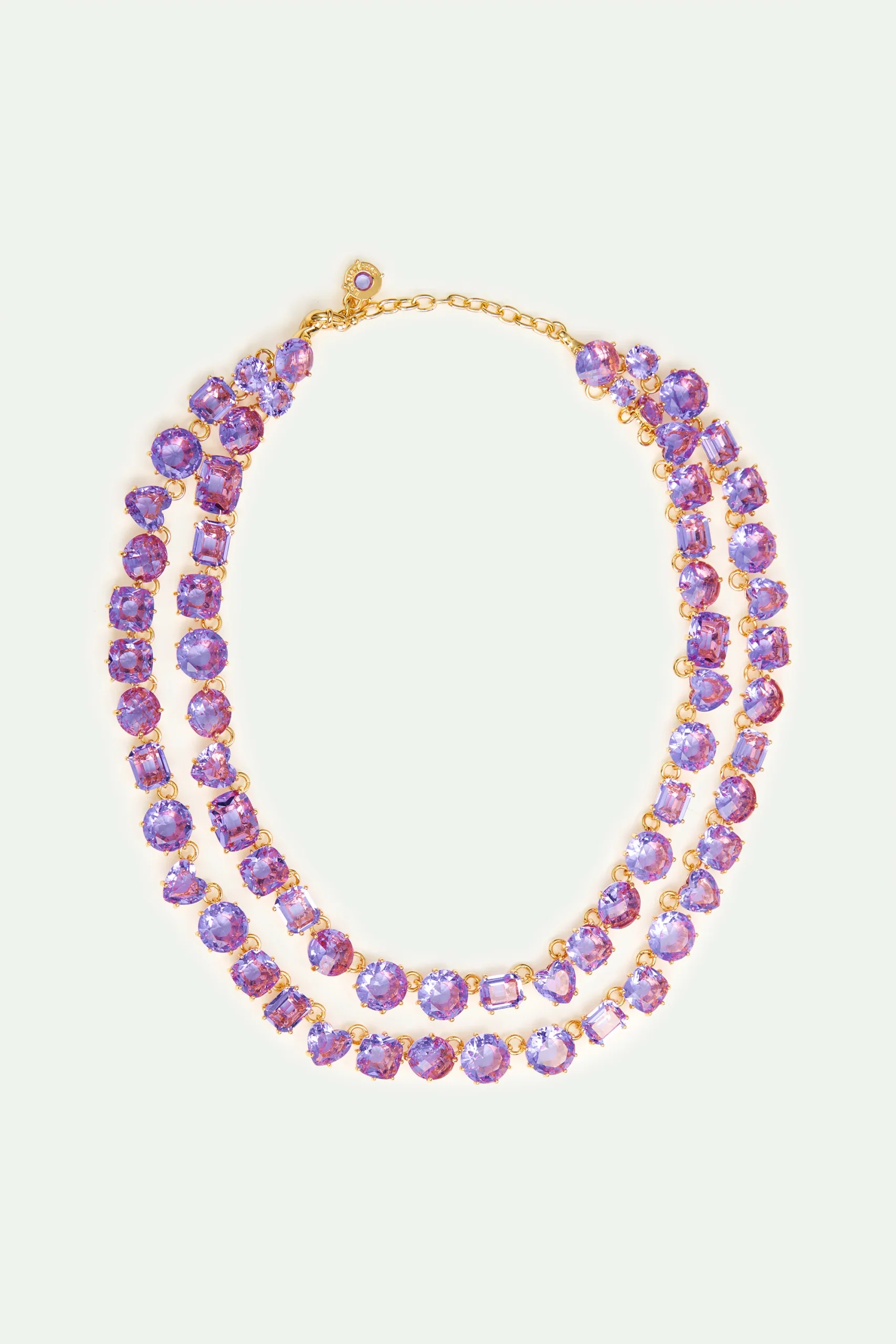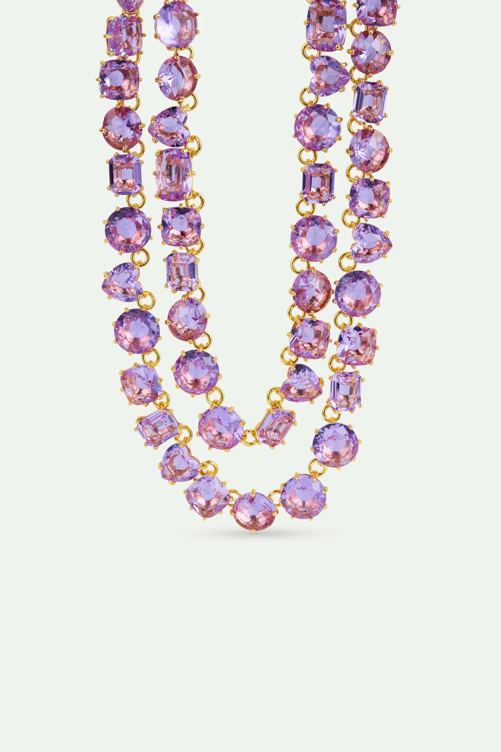 Collier plastron luxe présentant deux rangs de pierres rondes, carrées et en forme de cœur en verre facetté. L’élégante Diamantine se transpose cette année en Provence. La collection revêt le raffinement bucolique d’une prairie où marguerites et lavandes aromatiques ondulent dans le vent. Une parure féminine composée de pièces aux nuances douces qui nous renvoient à la quiétude d’un rayon de soleil rasant les tonnelles.