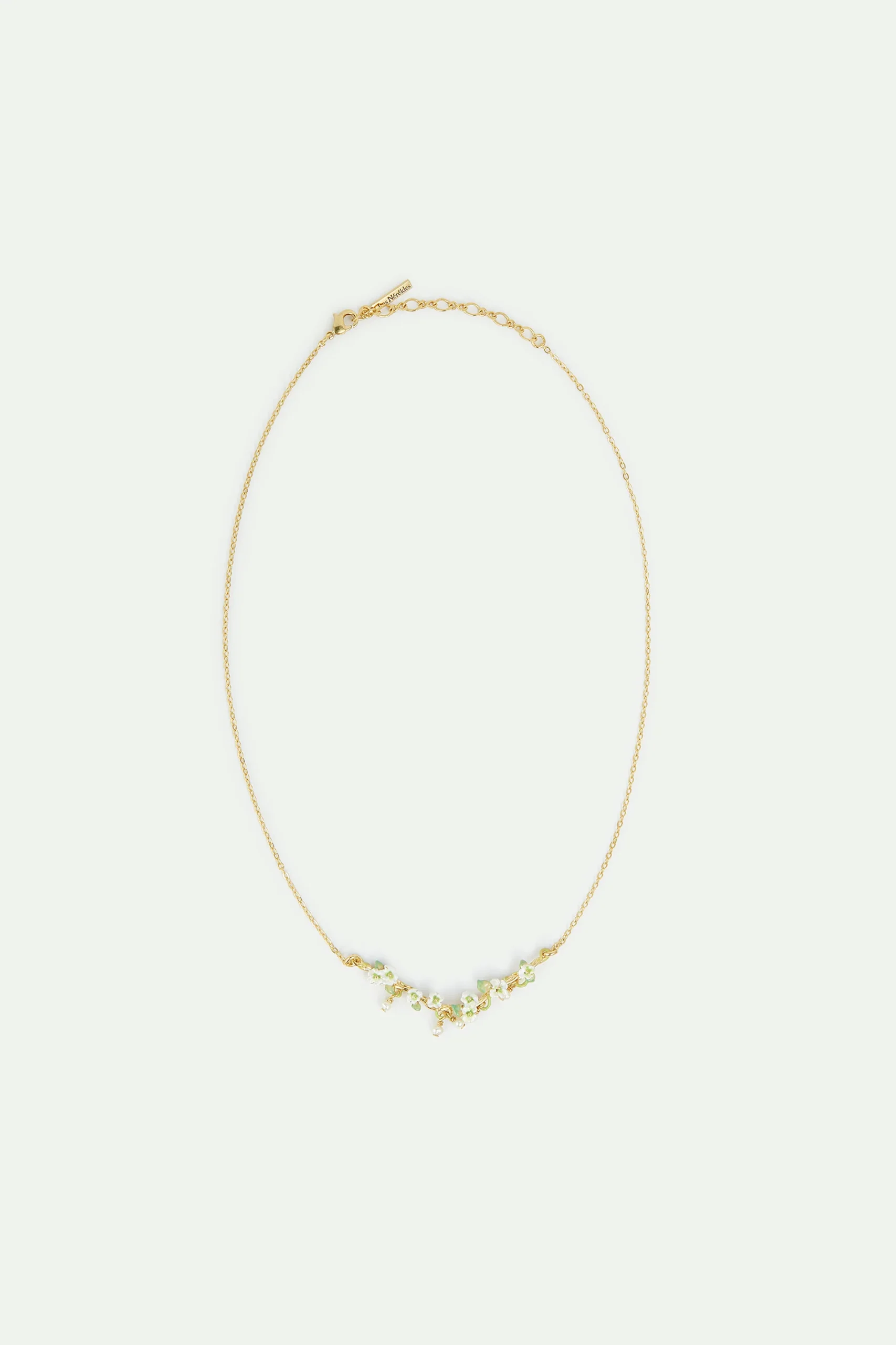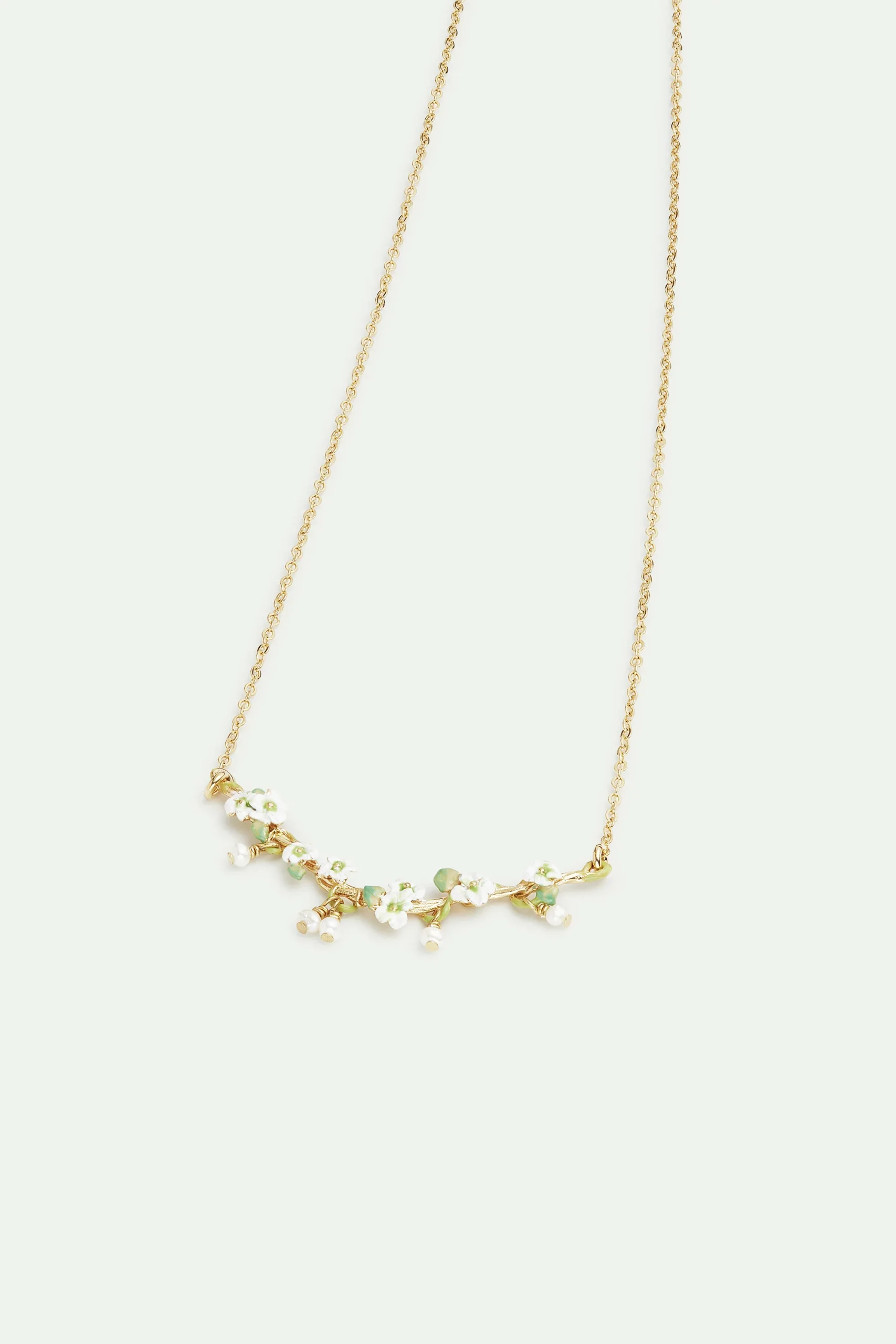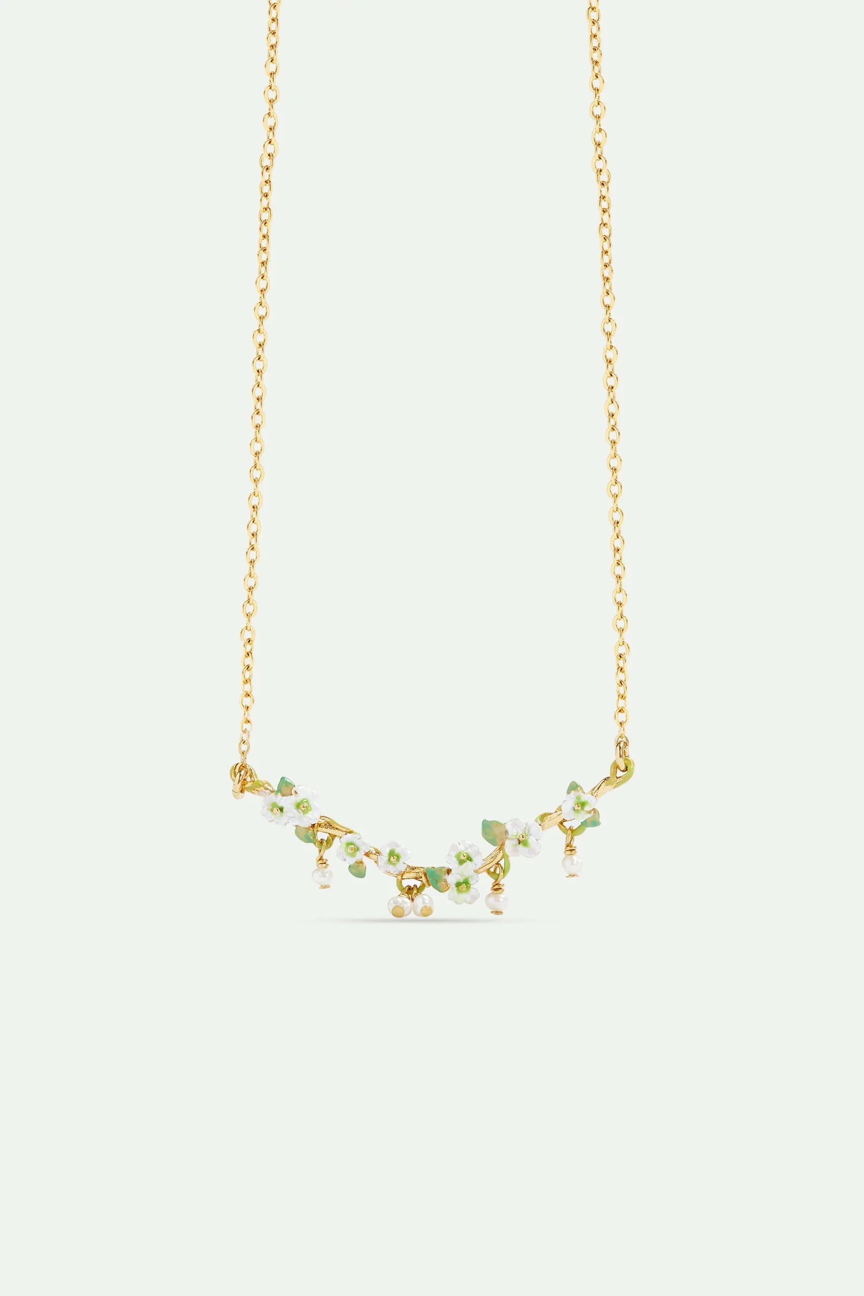 Collier plastron d’inspiration végétale, doré à l’or fin 14 carats, petites fleurs blanches roses trémières, perles nacrées pendantes. La collection Jardin d’Hortense célèbre avec douceur les jardins d’été.