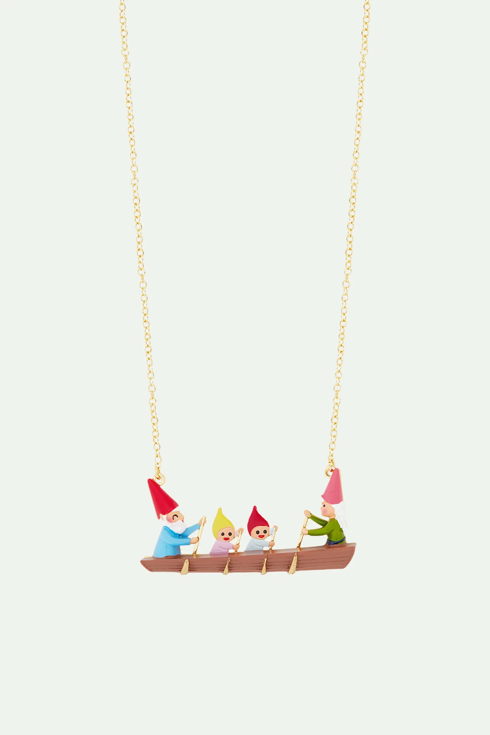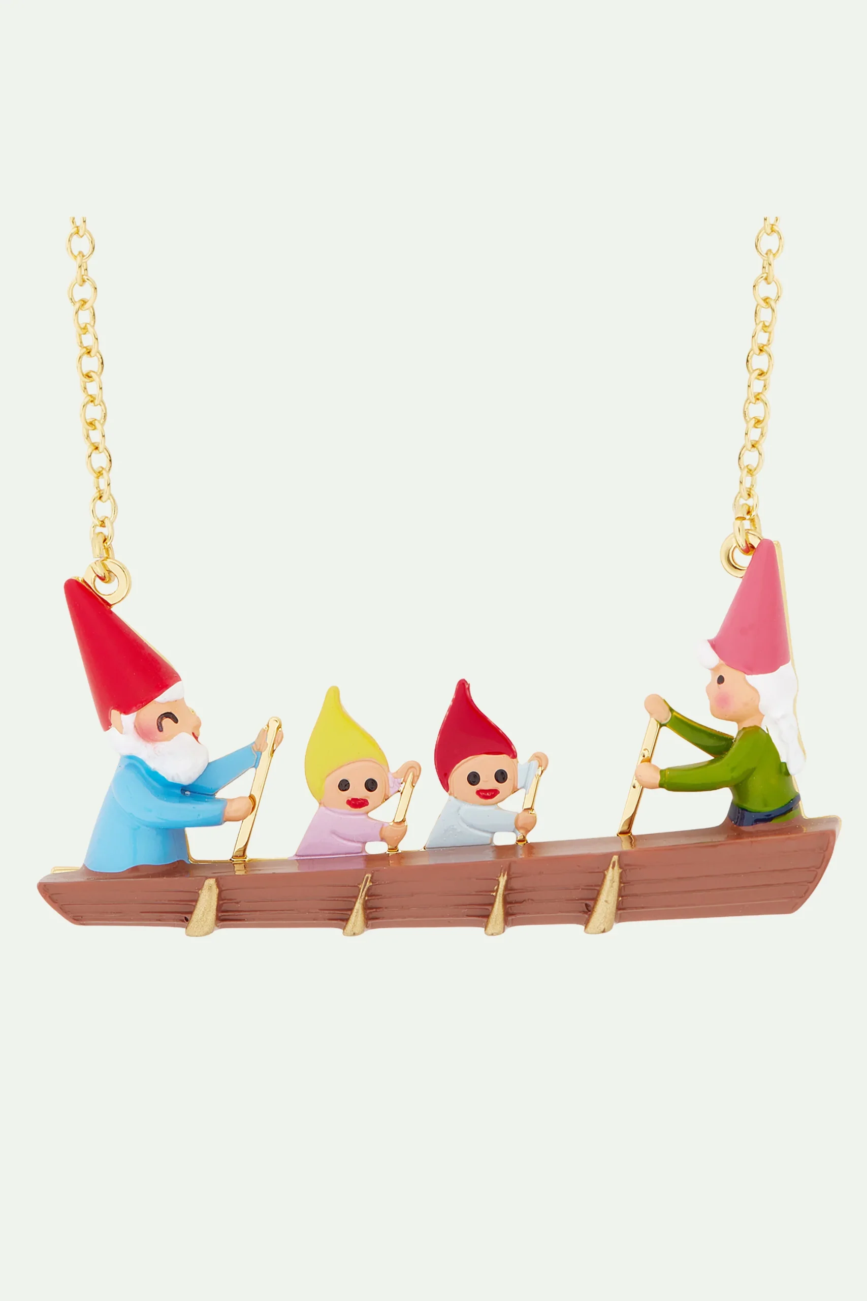 La famille Champimignon composée des parents et des enfants s’en va pour une balade en pirogue sur ce collier plastron haute fantaisie. Confortablement assis sur leur embarcation en bois, ils pagaient joyeusement et profitent de leurs vacances paisiblement. Cette famille de nains de jardin aussi attachante que drôle vit mille et une aventures dans cette collection de bijoux signée N2 by Les Néréides. Cet hiver, accompagnez-les à la montagne pour des vacances au grand air. Collier Plastron : Laiton doré à l’or fin, résine peinte à la main et fine chaîne dorée.