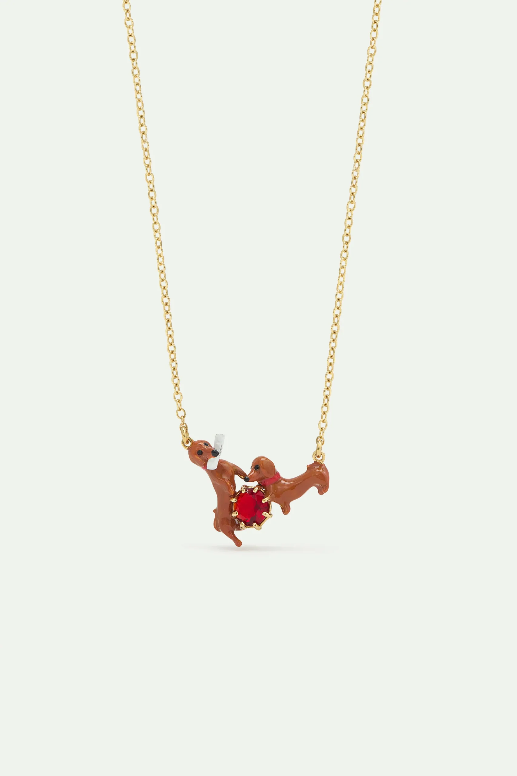Collier plastron, deux chien teckels marrons peints à la main, l’un attrapant un journal avec sa bouche et l’autre à quatre pattes, verre facetté rouge bordeaux au centre.