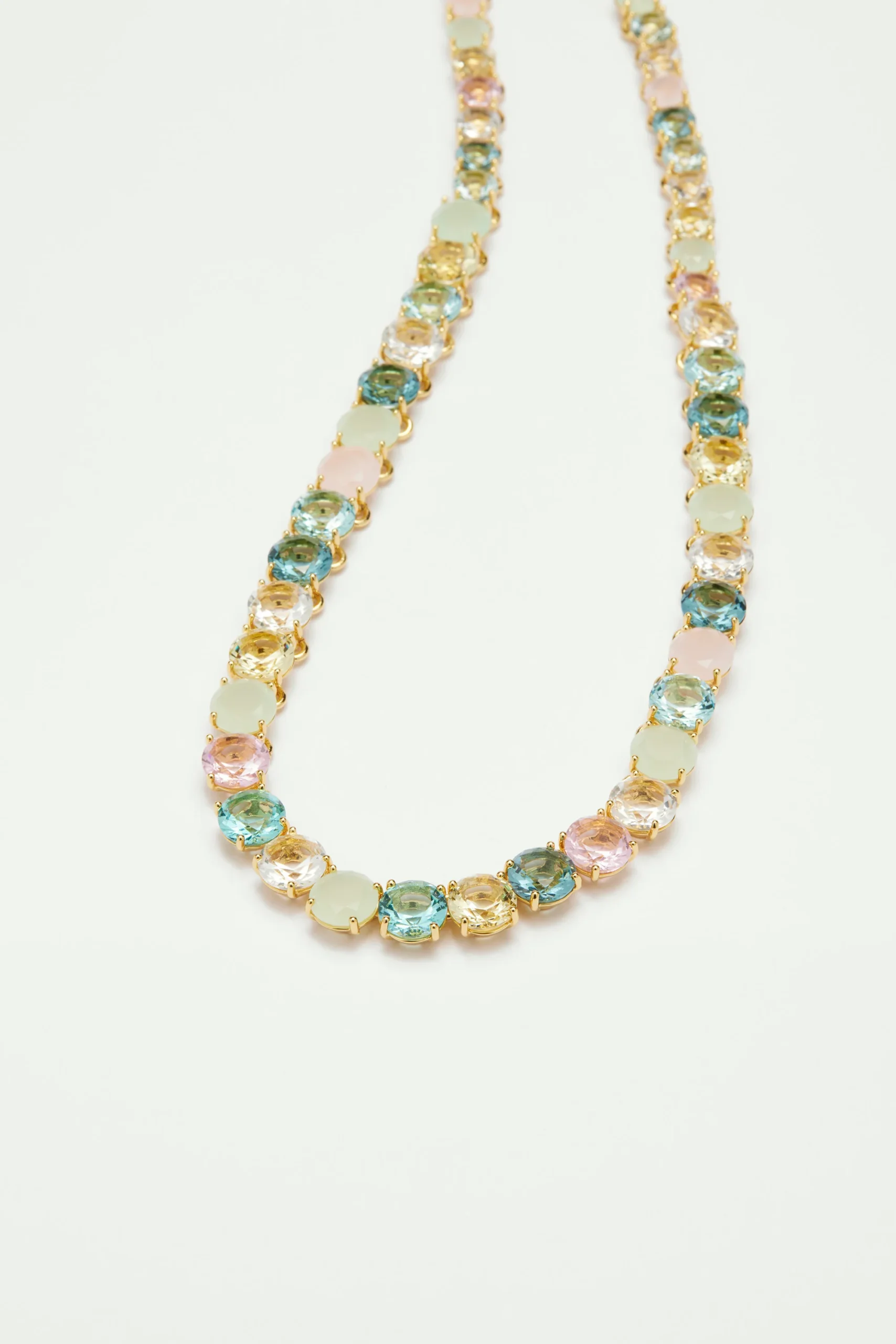 Parez-vous d’un collier Ras de Cou Luxe Pierres Rondes La Diamantine Acqua Azzura. Collection iconique de La Maison Les Néréides, elle revient cette saison avec des bijoux multicolores dans une version fraîche et acidulée. Bleu, quartz rose, aquamarine, cristal de roche, tantôt transparent, tantôt translucide, cette version élégante saura illuminer et mettre en valeur votre teint hâlé. Ras de Cou : laiton doré à l’or fin, verre facetté