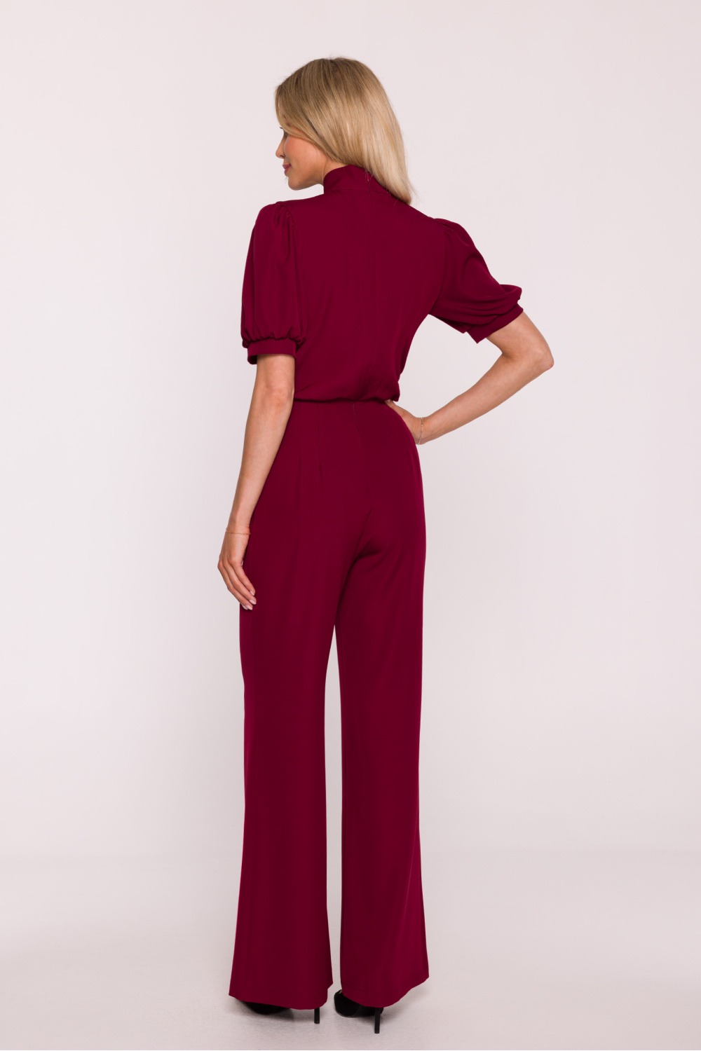 Un élégant tailleur pour femme est une alternative élégante à la robe, un choix idéal pour des occasions spéciales et des sorties élégantes. Fabriqué dans un tissu lisse légèrement brillant, il présente une allure très chic tout en garantissant un grand confort. Le modèle se distingue par son décolleté féminin en forme de V, associé à un col montant se transformant en un joli nœud qui ajoute une touche de délicatesse à l’ensemble. Les manches courtes bouffantes se terminent par des poignets avec de légères fronces, donnant à la silhouette légèreté et un caractère romantique. Le haut a une coupe légèrement blousante, tandis que la taille haute souligne joliment la silhouette et allonge visuellement les jambes. Les jambes sont longues, larges et légèrement évasées vers le bas, donnant à la silhouette des proportions élégantes et assurant une grande liberté de mouvement. Le tout est complété par une fermeture éclair dissimulée à l’arrière, garantissant un ajustement parfait. Conçu et fabriqué en Pologne avec une attention particulière aux détails et à la plus haute qualité de finition.