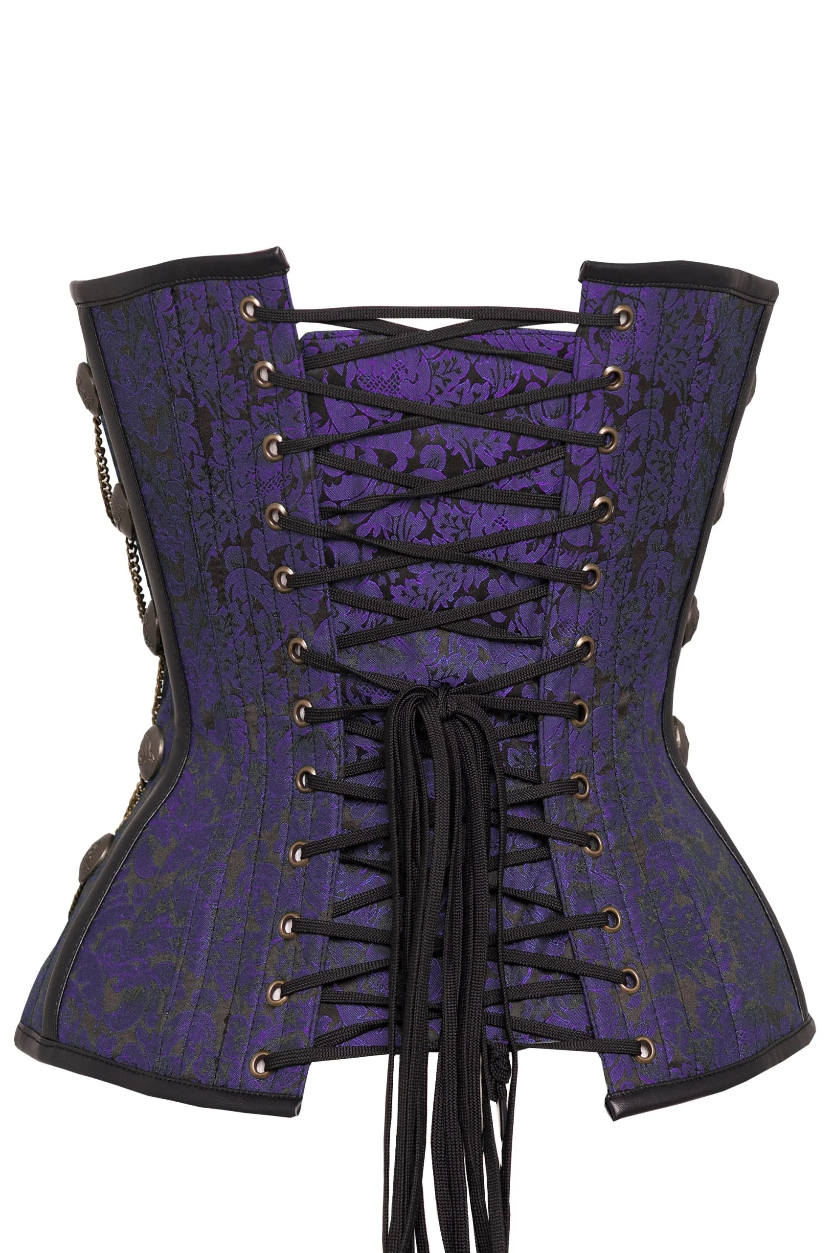Ce corset steampunk violet foncé est livré dans un joli motif brocart et est fini avec des chaînes et des clous reflétant les deux côtés. La fixation au milieu est des boucles en laiton qui ajoutent quelque chose de plus inhabituel à la pièce. Si vous êtes un connaisseur de steampunk alors c’est certainement le corset pour vous.