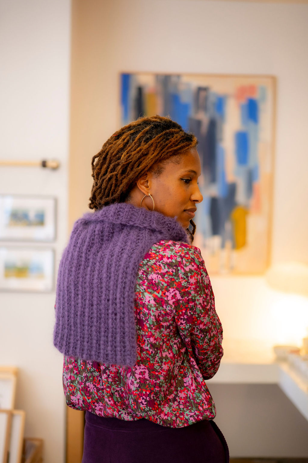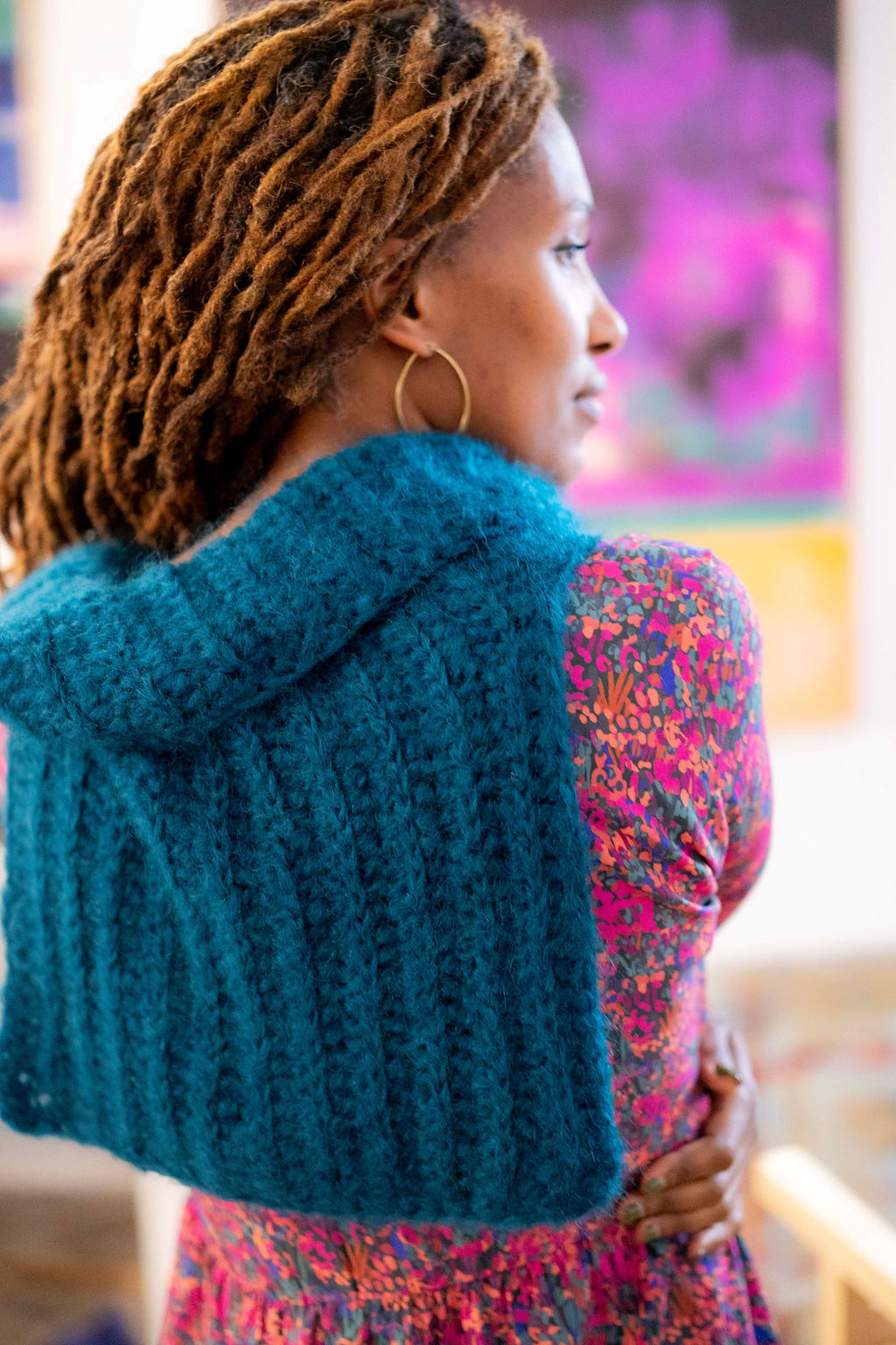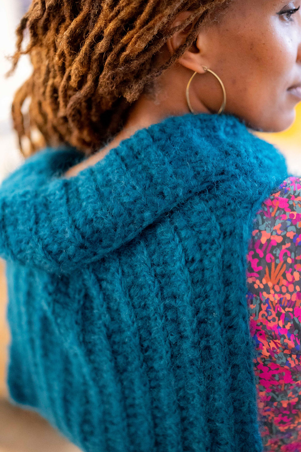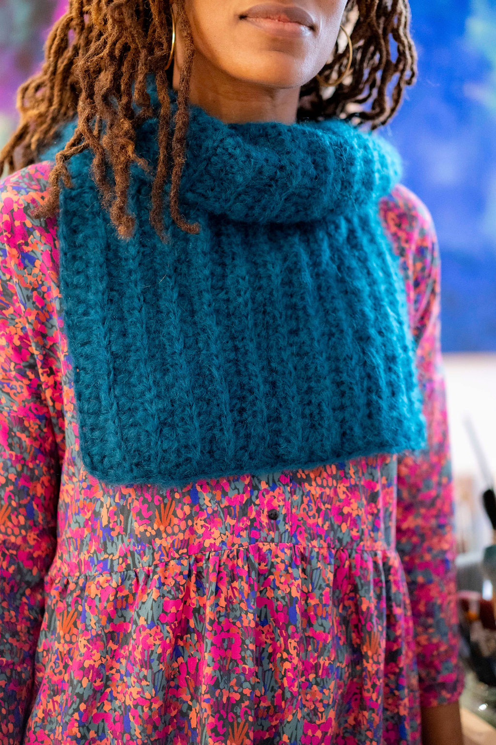 Ce col est pensé pour être porté sous un manteau ou un gilet et son plastron descend sous la poitrine pour avoir vraiment chaud. Un peu oversize c’est une pièce de vêtement à part entière et il compléte à merveille une tenue. Ce col est l’occasion d’apprendre à faire des grosses côtes façon tricot, au crochet. A plat 50 cm de haut et 45 cm de large.