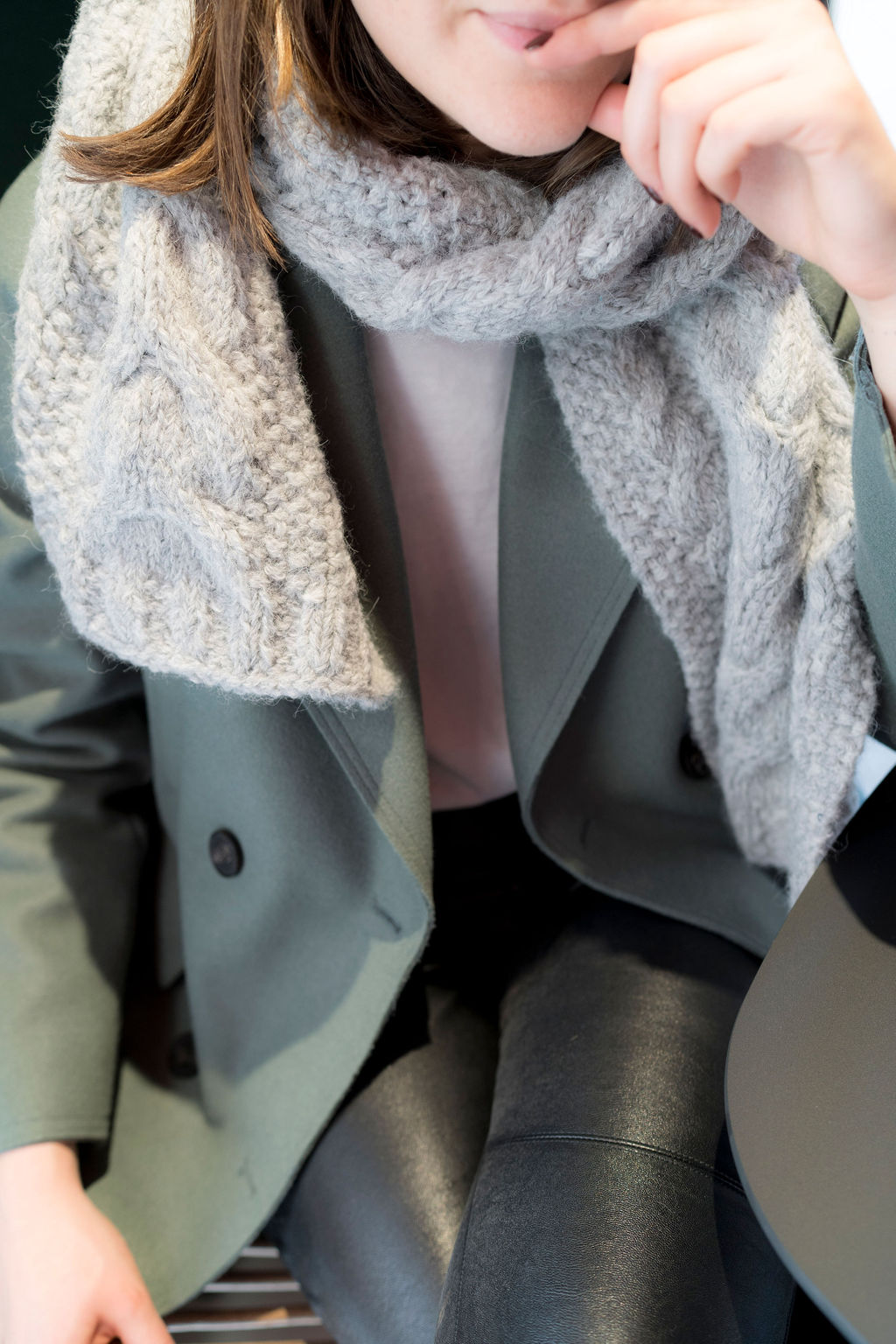 Avec ce kit vous réaliserez Copenhague, une belle écharpe à grande tresse centrale.