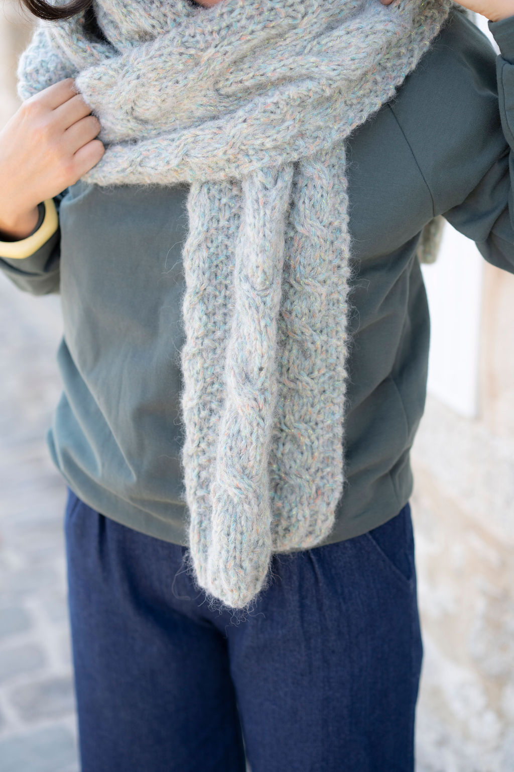 En aiguille 10, l’écharpe nécessitant 4 pelotes se monte vite. A la fin vous aurez une écharpe épaisse et douillette d’une taille d’environ 180 cm.