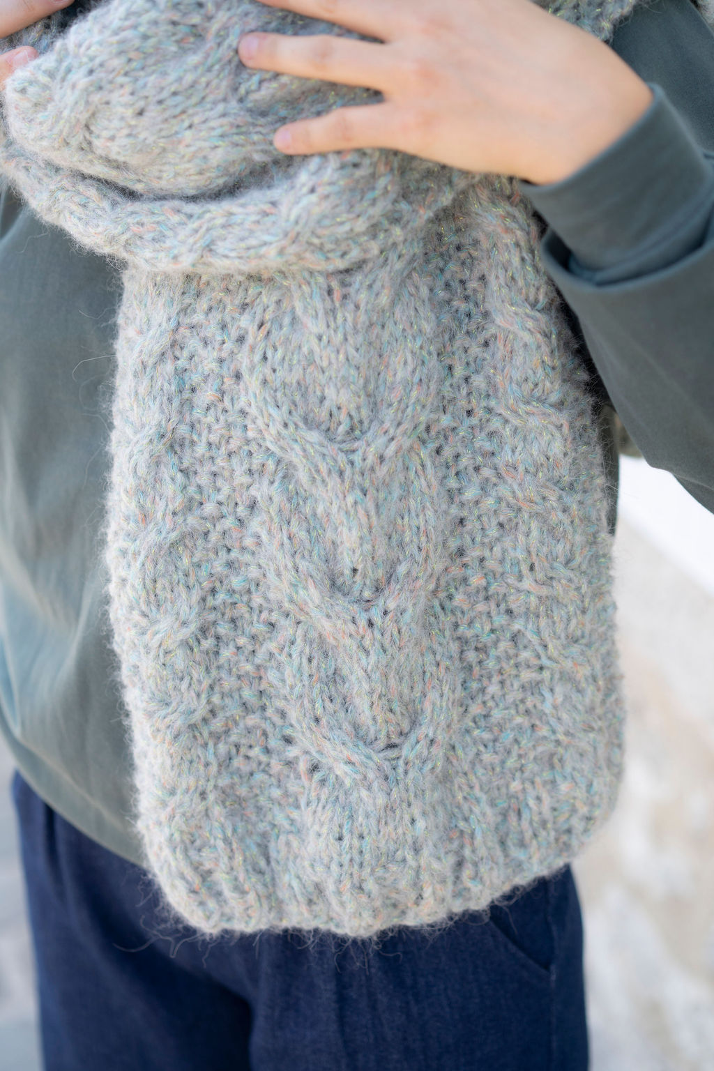 Le fil de très belle qualité est composé à 90 % d’alpaga et de 10% de polyamide. C’est un fil Lang Yarn, un des plus beaux que nous ayons eus, avec des couleurs profondes très réussies. Il vous tiendra chaud et, très léger, vous aurez un vrai à plaisir à le travailler et à le porter.