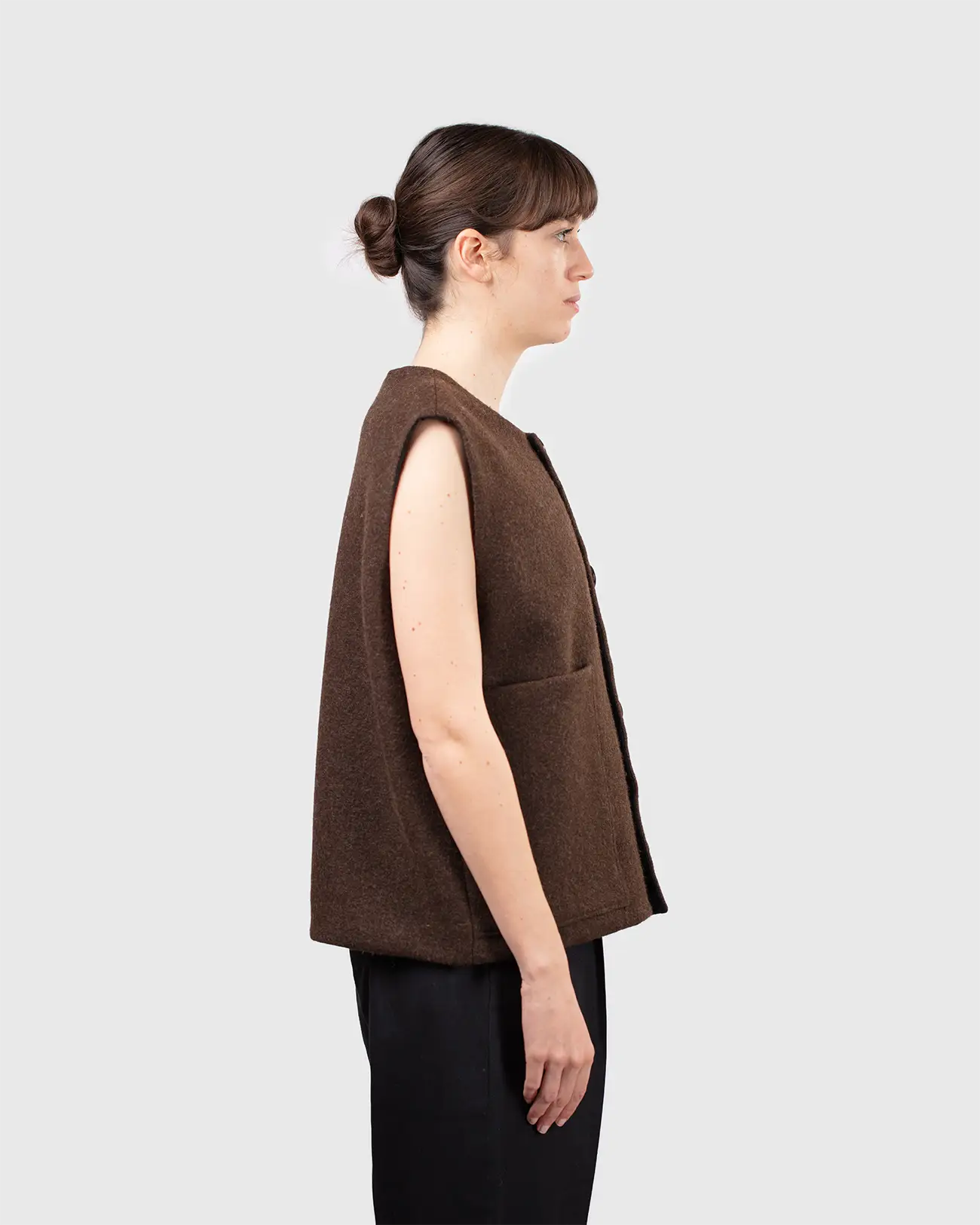 La forme sobre et stricte est complété par une encolure ronde – apportant de la douceur à l’ensemble.