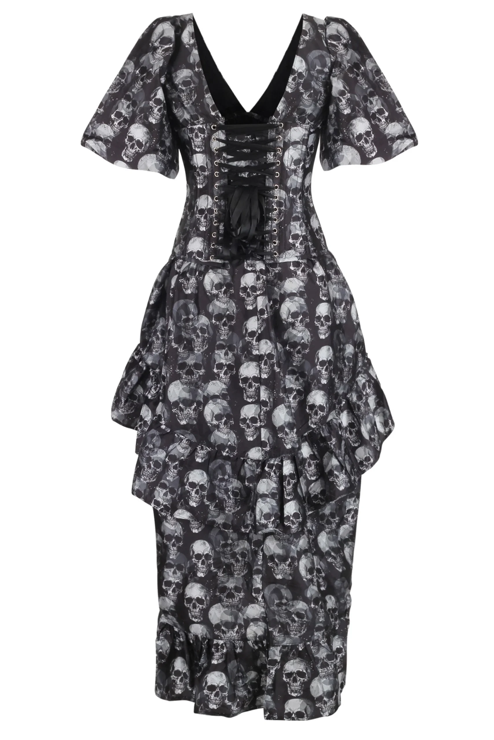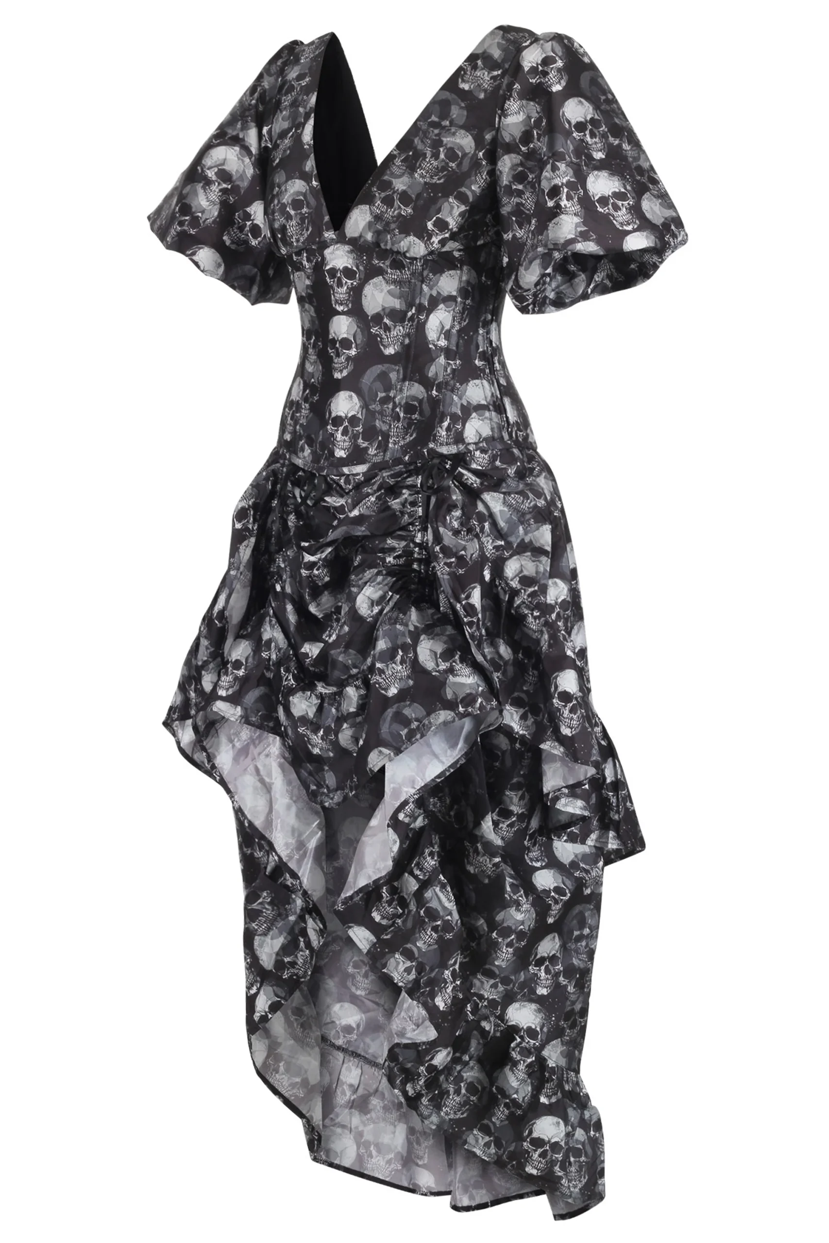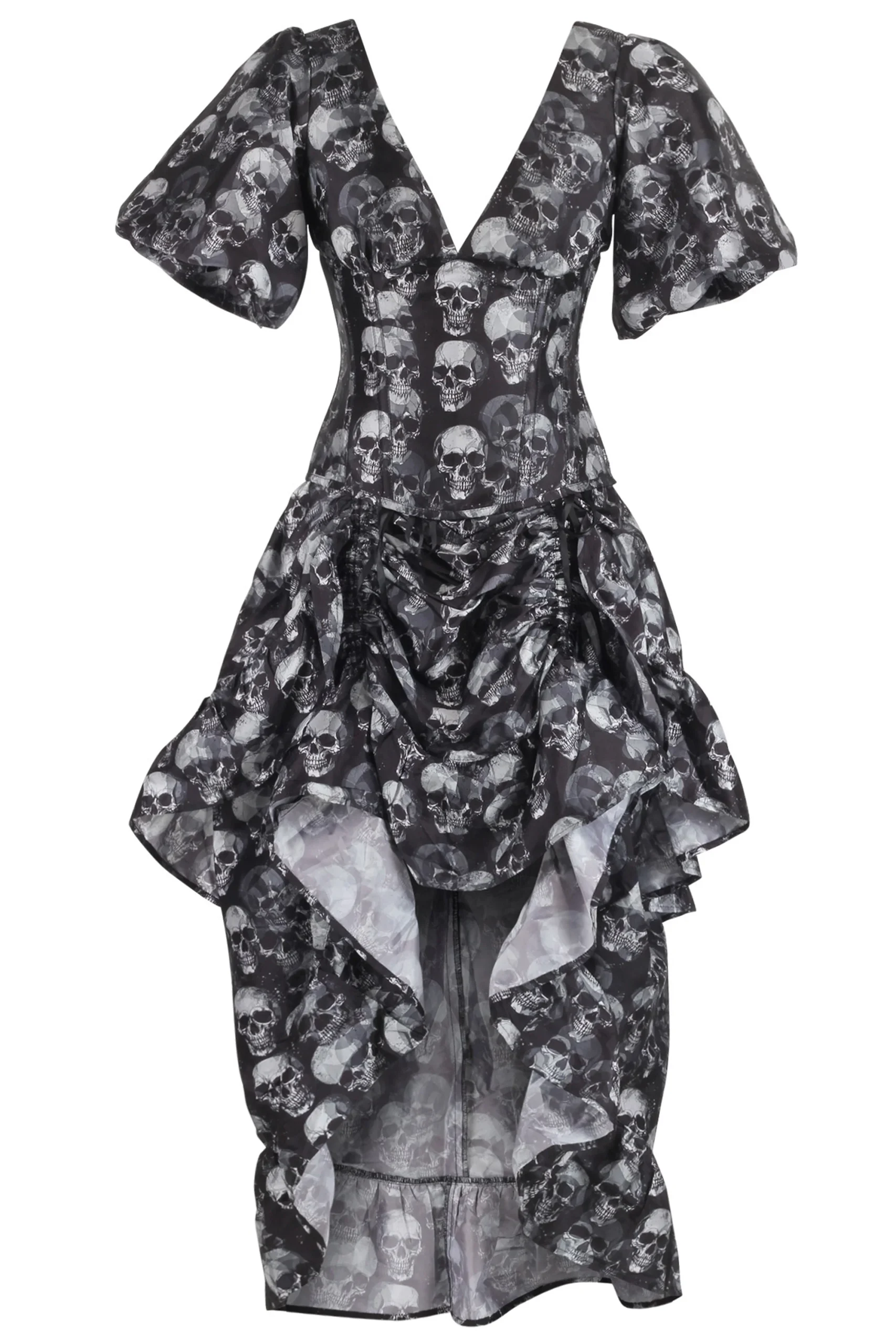 Dramatic, dark, and utterly captivating—this Gothic Skull Print High-Low Corset Dress is a showstopper for any alt-fashion wardrobe. The dress features an all-over grayscale skull pattern on lightweight fabric, with a plunging V-neckline and voluminous puff sleeves that add a vintage Victorian flair. The fitted corset-style bodice enhances your silhouette with a lace-up ribbon detail at the back, allowing for a customizable fit.