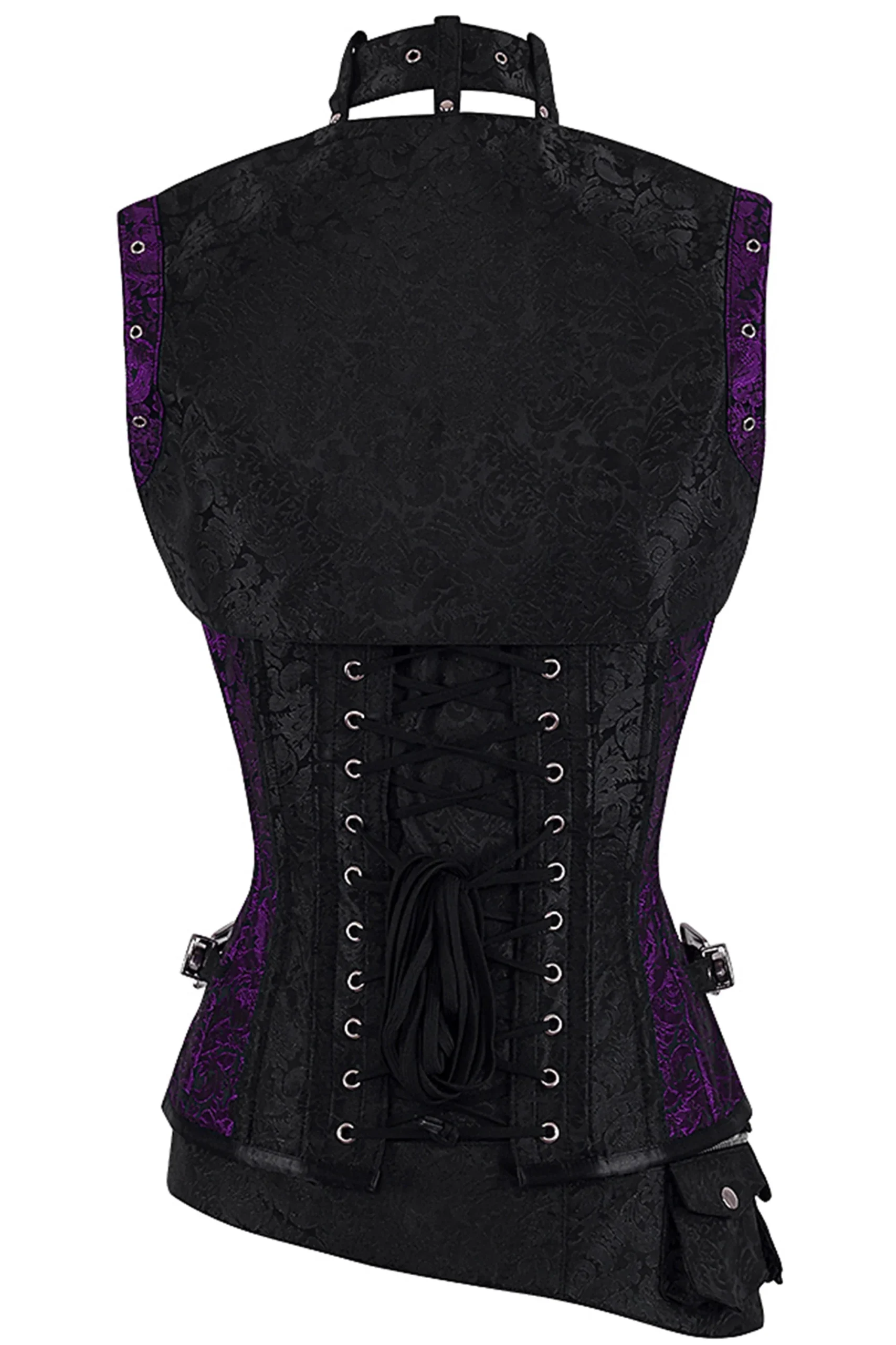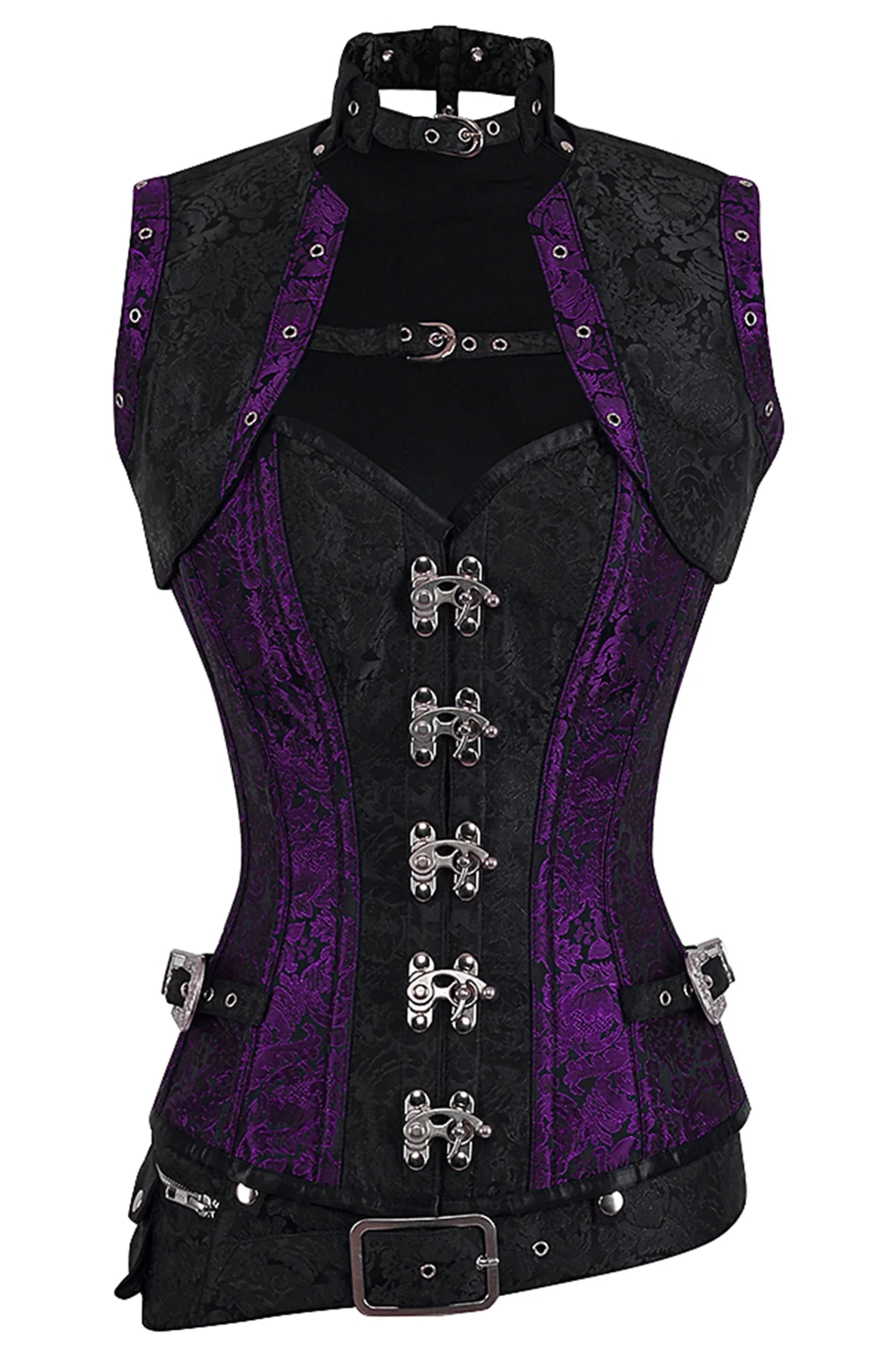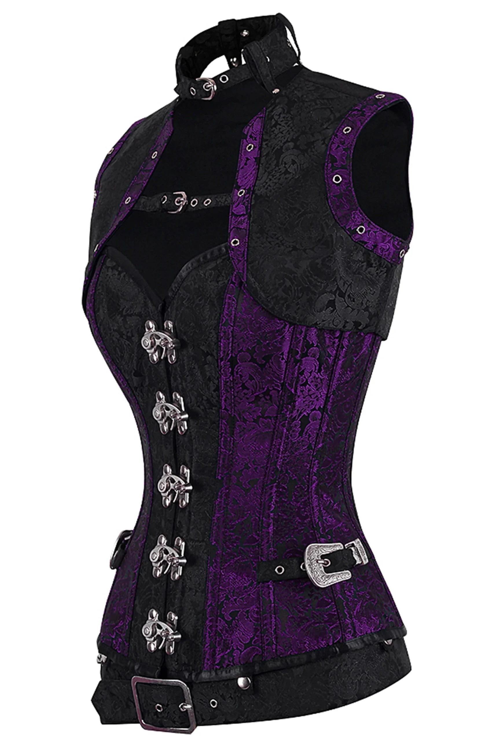 A detachable black shoulder capelet, trimmed with matching purple jacquard panels and riveted details, enhances the corset’s dramatic appeal. The high neck collar includes a buckle strap for a commanding finish, while side belts and silver rivets add functional and decorative touches.