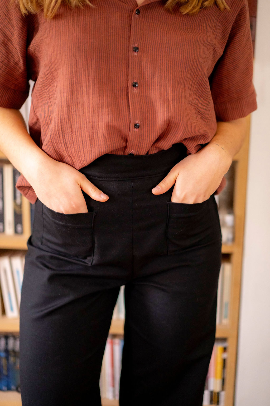 Deux longueurs de jambes sont proposées, longueur chevilles et longueur 7/8 mais également deux types de ceintures. Vous pourrez choisir entre taille mi-haute, la taille se monte alors avec une parementure, ou une taille franchement haute, où on vient monter une ceinture sur la taille. Vous pourrez donc réaliser quatre versions différentes à partir de notre patron. Sans oublier que vous pourrez également jouer avec les poches : avec ou sans, devant ou derrière, autant de détails pour des looks différents.