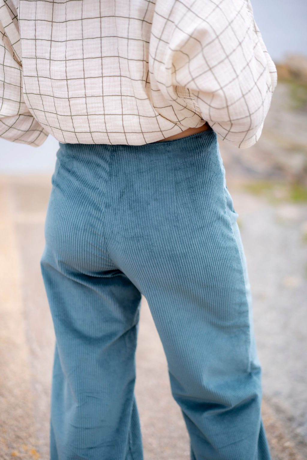 La coupe de notre pantalon Swann est bien ajustée au bassin. Il est conseillé de réaliser une toile auparavant. Si vos mesures vous indiquent que vous êtes entre deux tailles, taillez celle au-dessus.