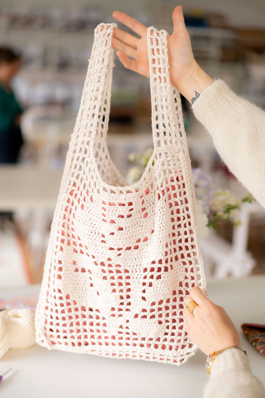 Avec ce sac filet on explore une nouvelle possibilité du crochet avec laquelle on n’avait pas encore joué chez Super Chouette et que l’on adore ! Il s’agit des motifs en grilles qui reprennent le principe des dessins pixellisés, où le motif est décomposé en petits carrés. Pour crocheter ce sac vous aurez à lire deux diagrammes qui permettent de dessiner une rose au recto et une tulipe au verso. La technique est simple et fun, et le résultat obtenu étonnamment moderne, avec une touche de romantisme. Dimensions : 35 cm de large, 33 cm de haut, 6 cm d’épaisseur.