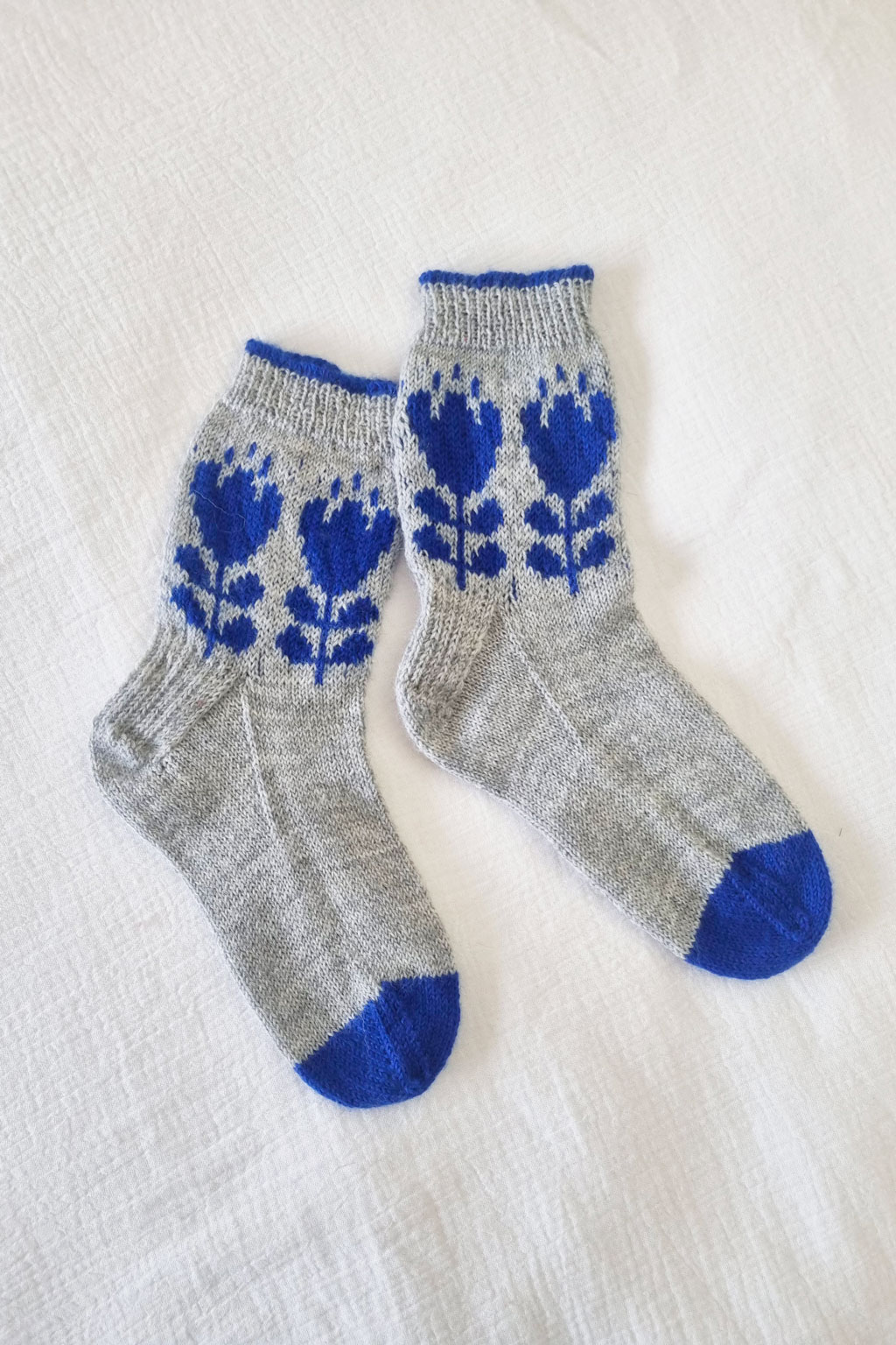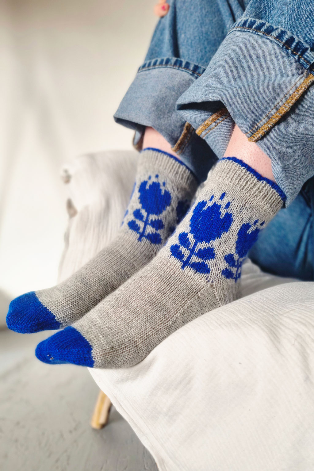 Tricotez votre paire de chaussettes fleuries en jacquard Crocus ! Modèle inédit créé par la talentueuse Emma Ducher, designer tricot à Lyon, pour Super Chouette. Nous avions une envie furieuse de chaussettes jacquard, mais avec un motif floral pour appeler le printemps, et Emma a comblé notre envie avec ce modèle original.