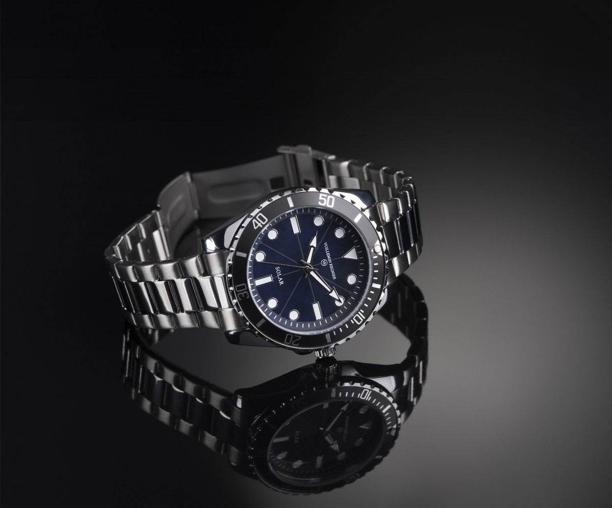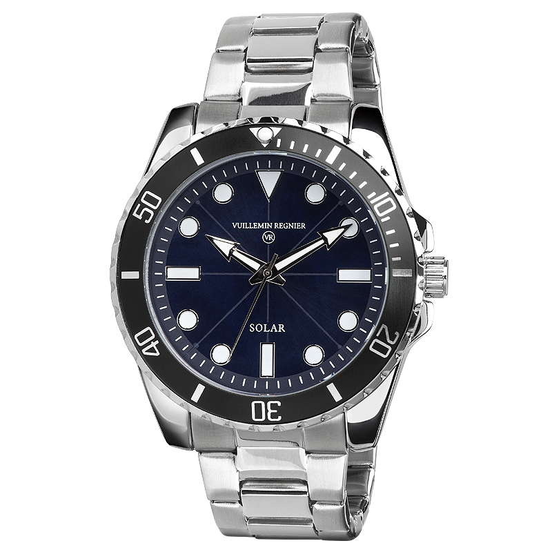 Cette superbe montre sans pile signée Vuillemin Regnier fonctionne 100% à l’énergie solaire. Son capteur se dissimule habilement dans le cadran noir chaussé d’aiguilles « flèches » électroluminescentes.