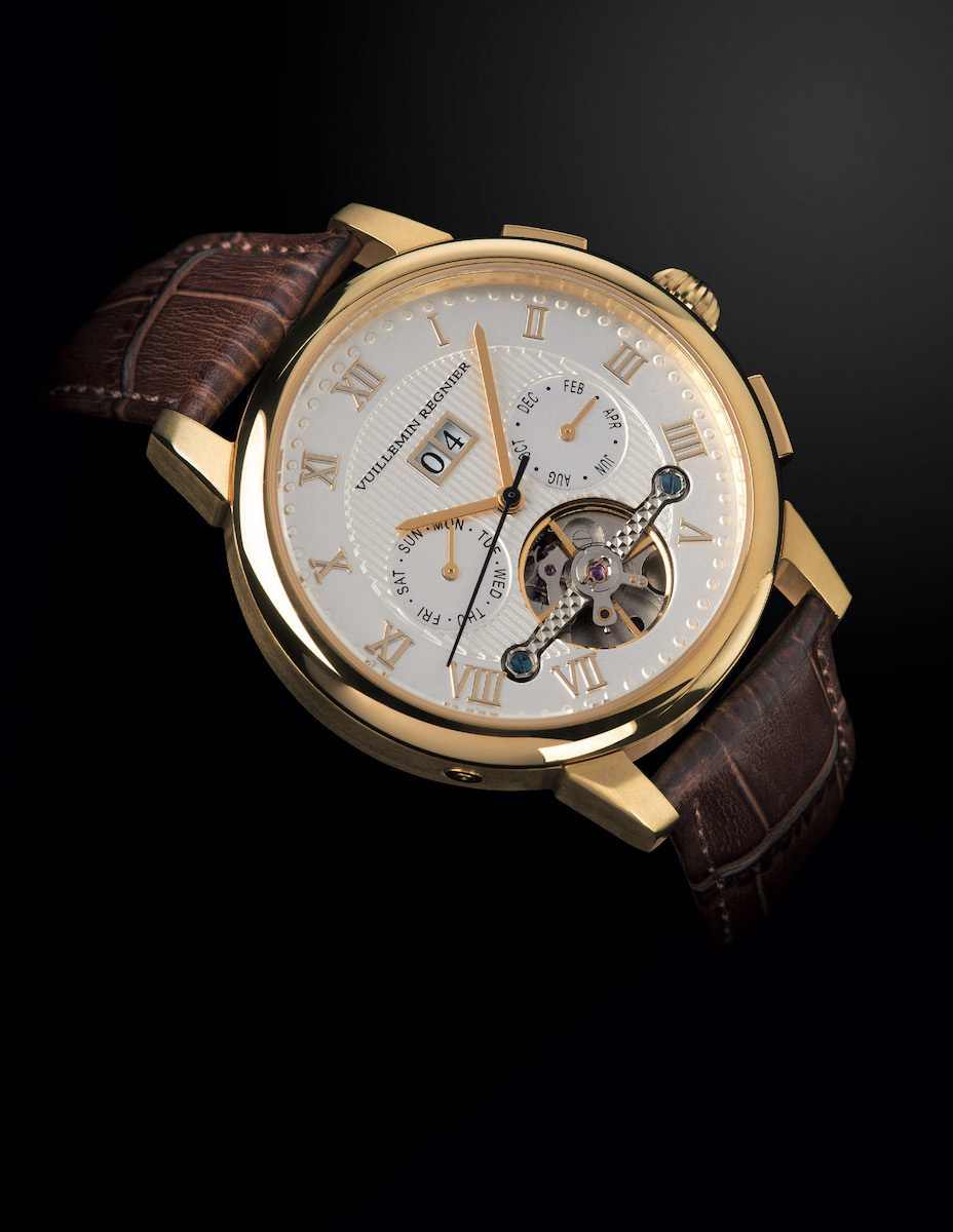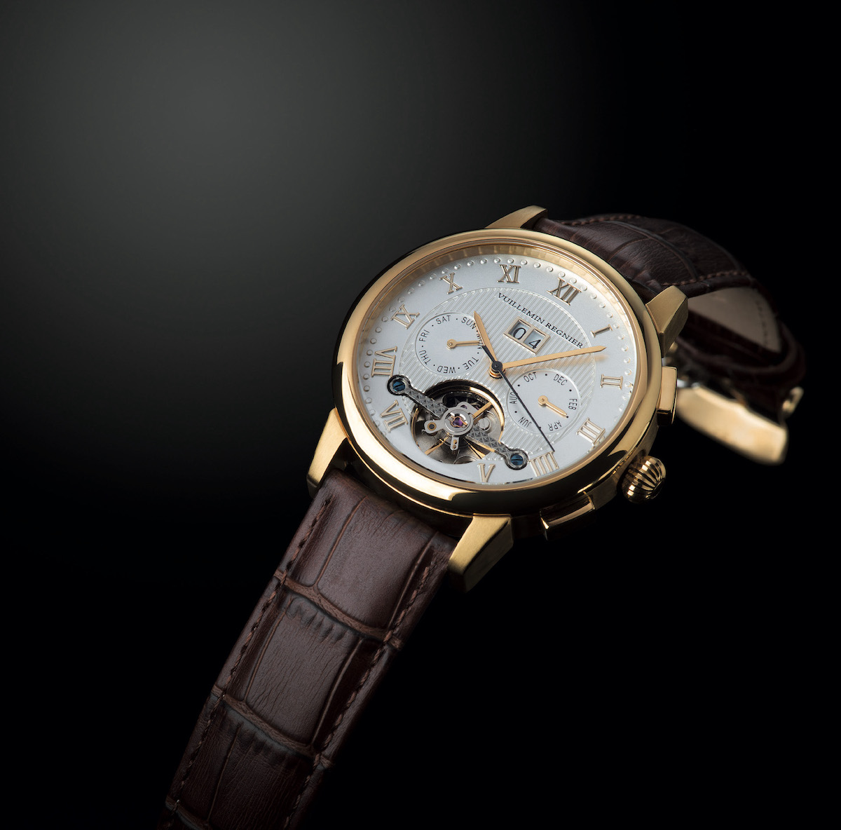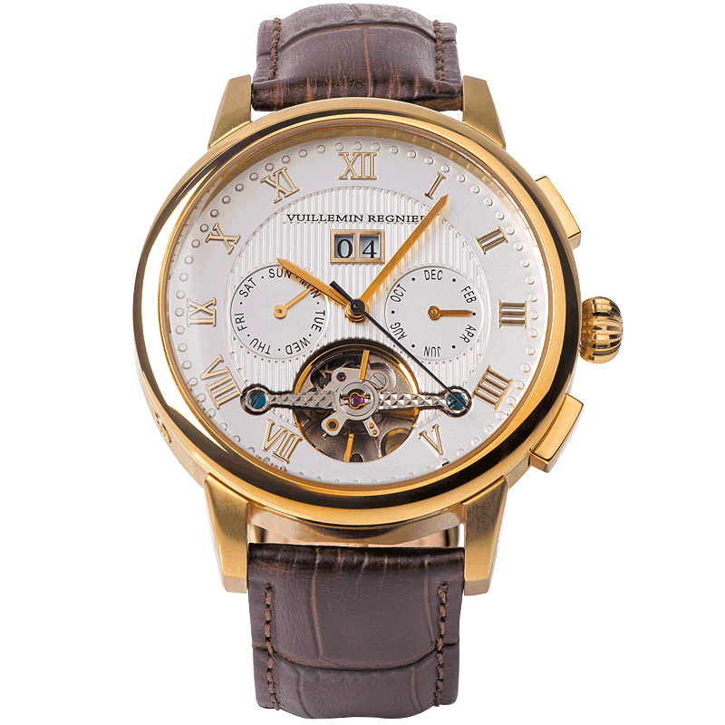 Sans pile, cette montre se remonte grâce au balancement du poignet et laisse apparaître son mouvement complexe sur le dessus du cadran et sur son dos «squelette» transparent.