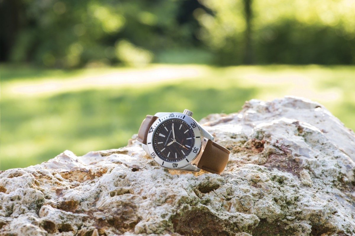 Cette montre de caractère, signée Vuillemin Regnier, incarne les valeurs de robustesse et sportivité. Son cadran aspect graphite associé aux aiguilles et index luminescents lui confèrent une grande lisibilité.
