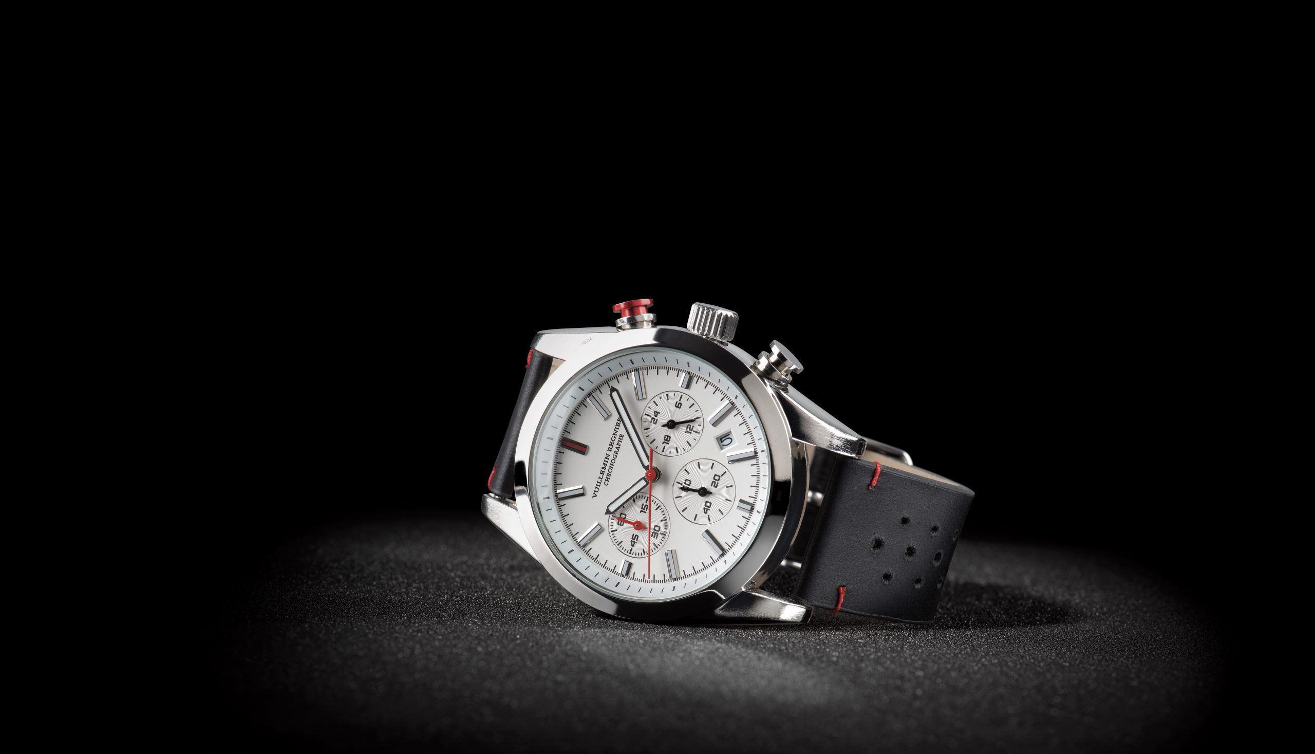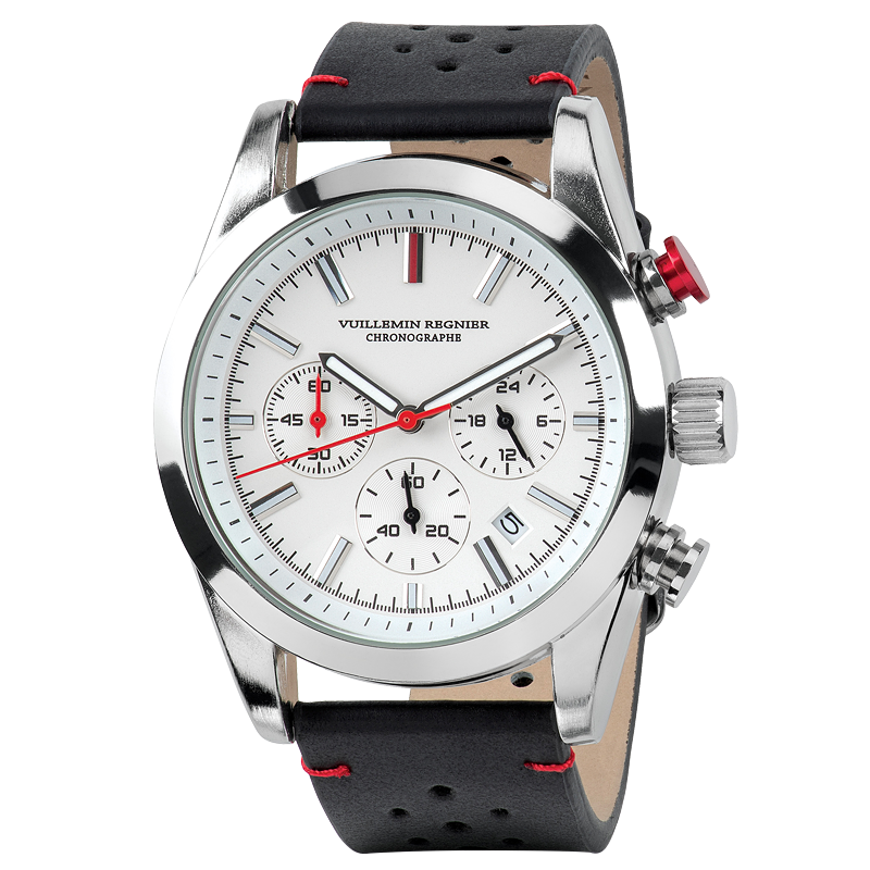 Ce modèle, aux lignes résolument sportives, évoque la course sur circuit avec ses touches de rouge apposées sur le bouton chronomètre,les aiguilles chronographe et