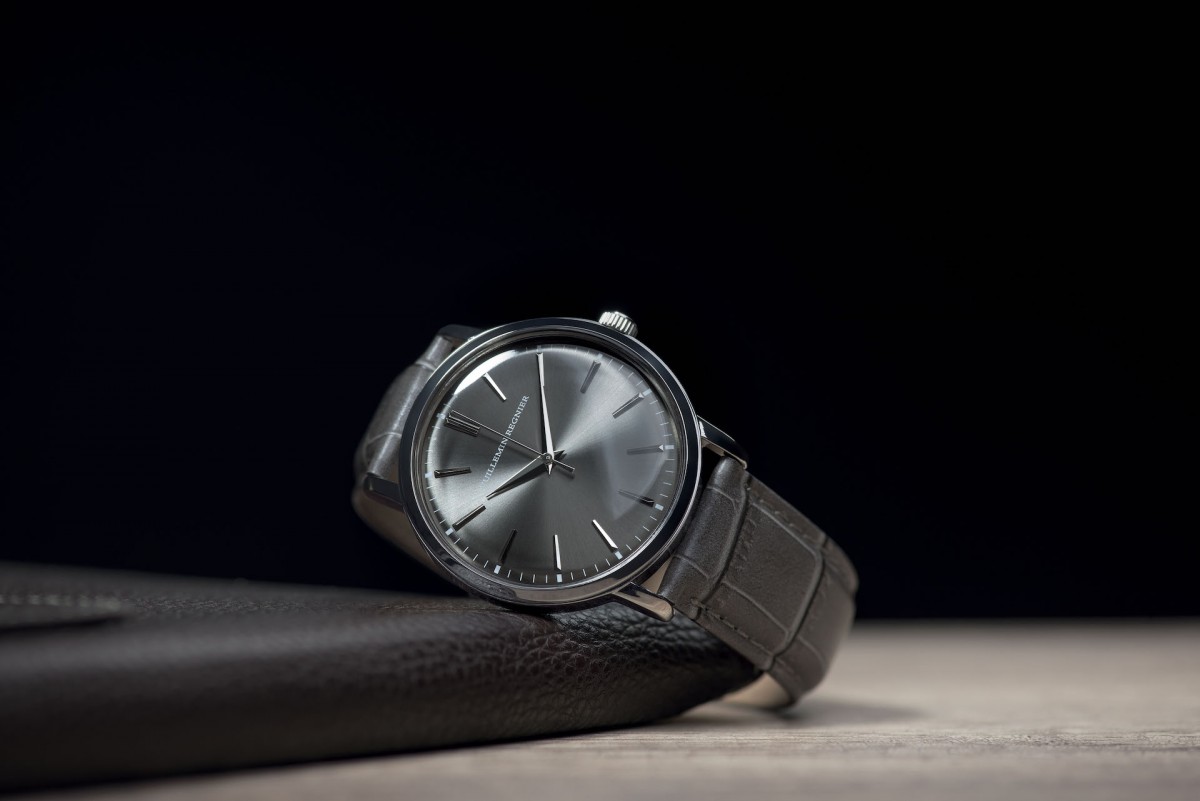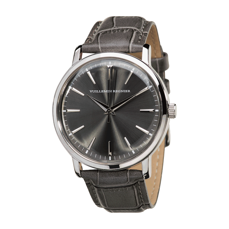 Véritable modèle de haute couture, cette montre se distingue par l’esthétique du cadran irisé de gris, l’élégance de ses index biseautés et la noblesse du bracelet cuir gris façon croco.