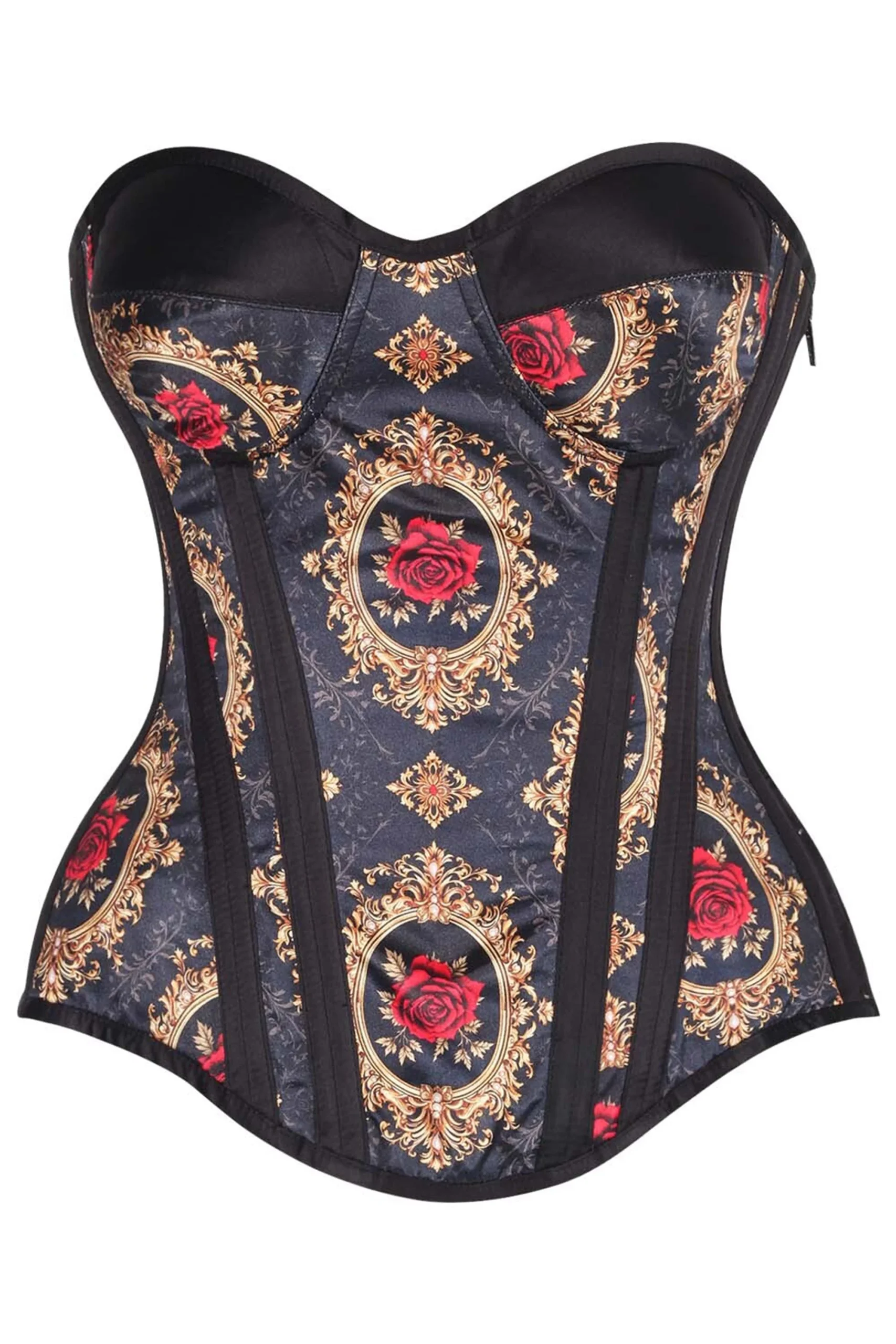 The back is laced up with wide black satin ribbon, adding both adjustability and a seductive finish. The side zipper offers convenient wearability without compromising the corset’s sleek, cinched look. Ideal for gothic fashion, burlesque styling, or a dramatic statement piece, this corset combines opulence and edge with striking visual impact.