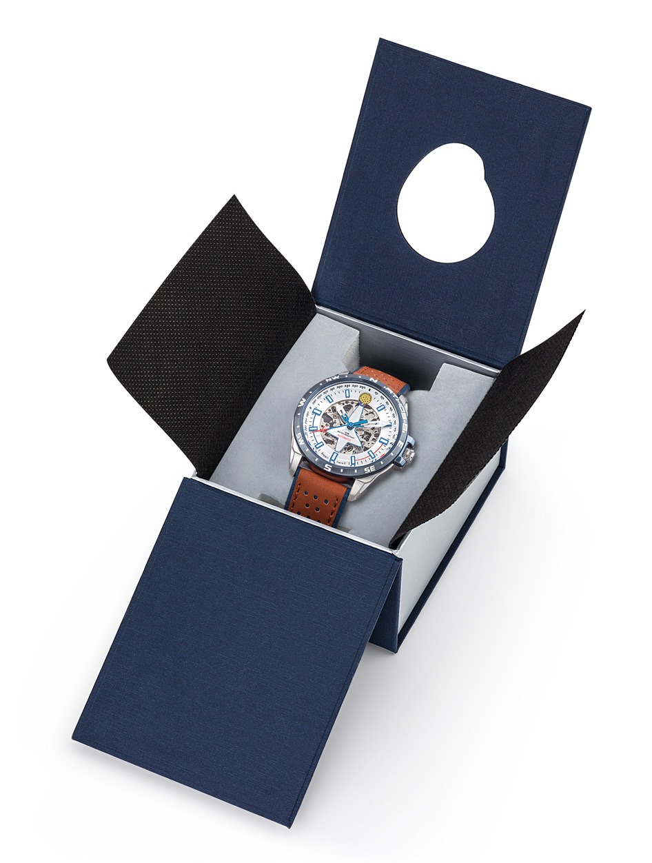 Doté d’une réserve de marche de plus de 40 heures et d’un rotor de charge unidirectionnel, le ressort de barillet se charge grâce aux mouvements de votre poignet et ne nécessite aucune pile.