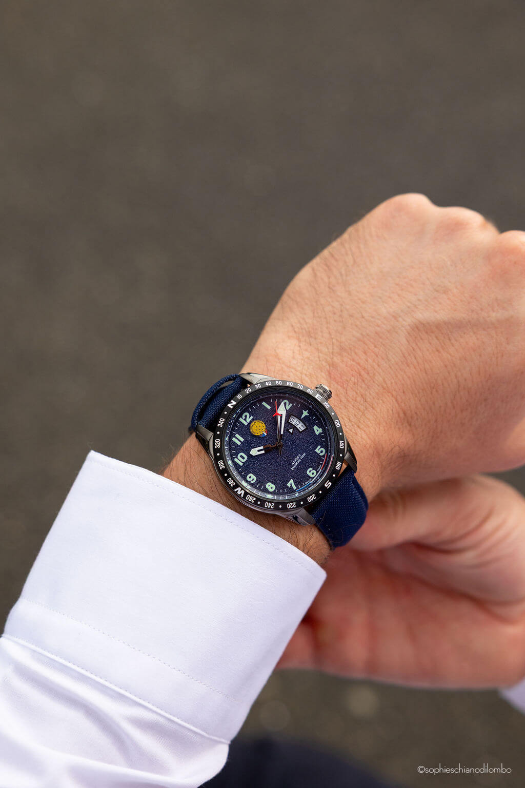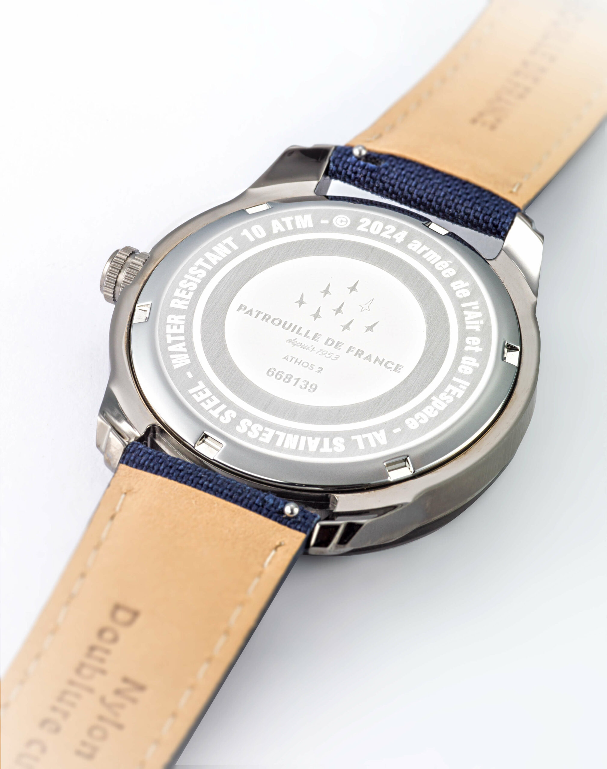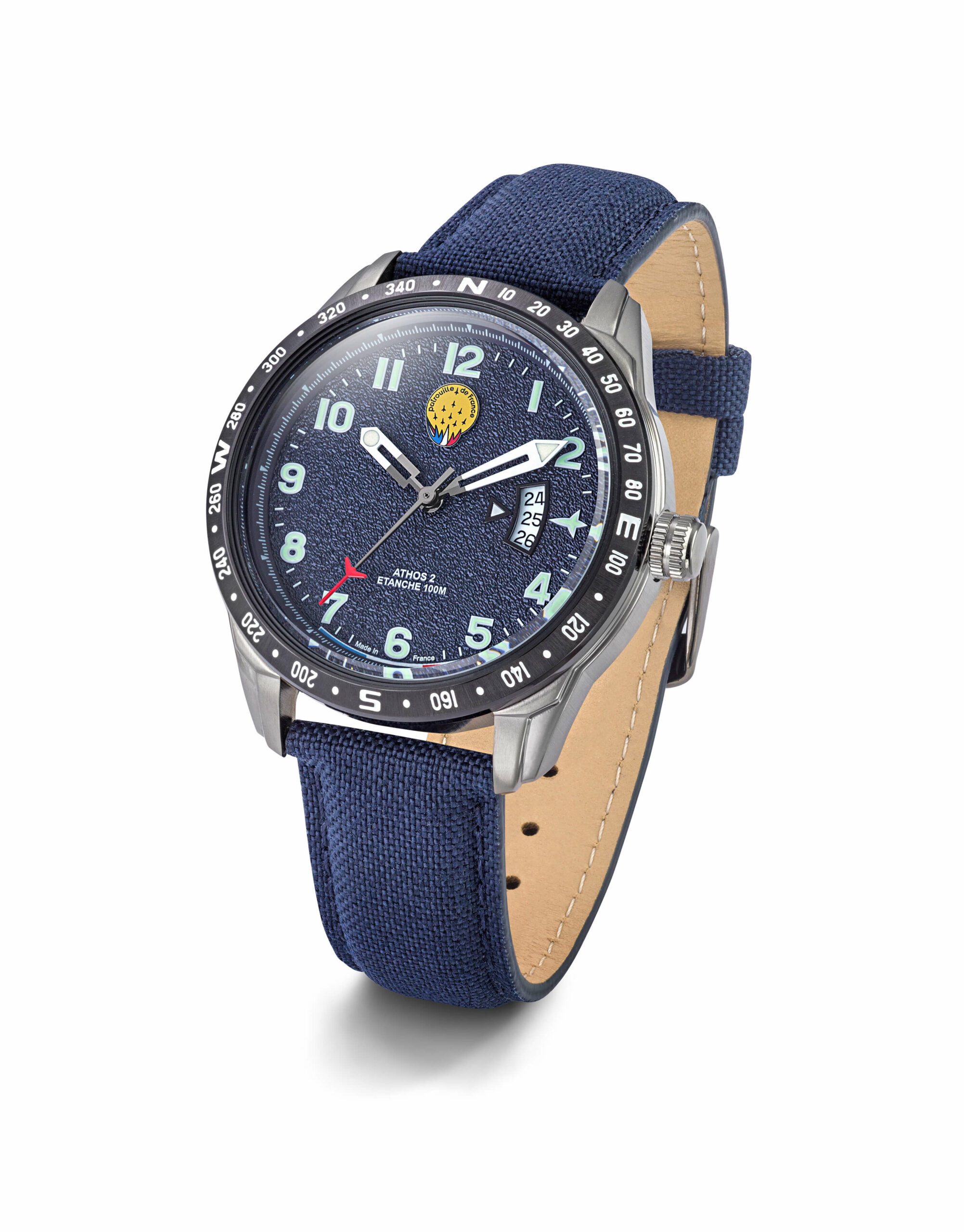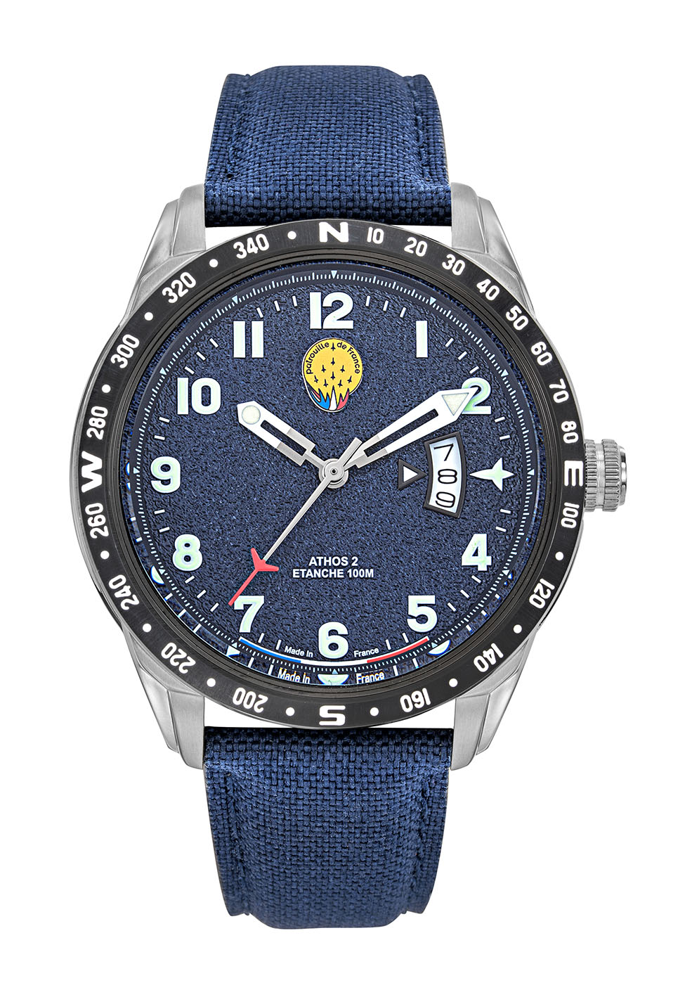 Dans sa version avec bracelet en cuir surpiqué notre modèle ATHOS 2 rappelle les blousons des aviateurs. Son bracelet tissé vert kaki ou bleu s’inspire quant à lui des Nato de l’Armée.