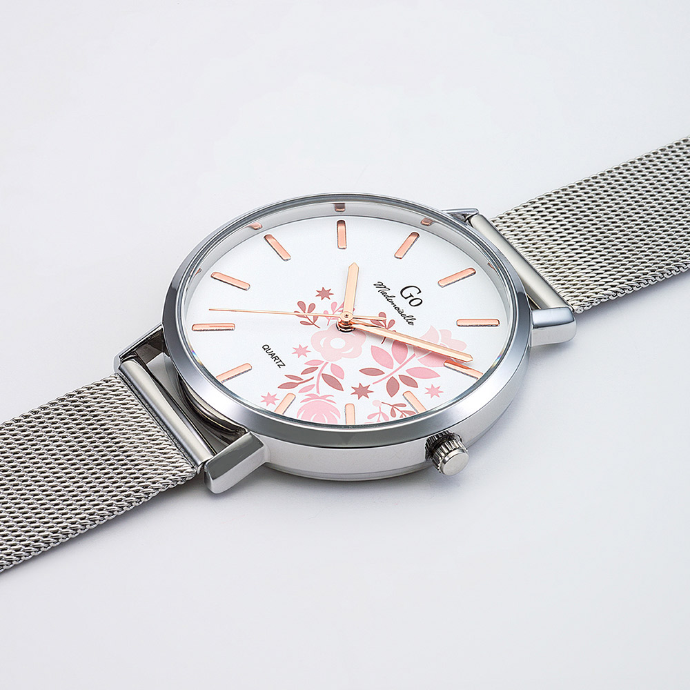 Difficile de ne pas craquer pour cette ravissante montre Go Mademoiselle 695910 ! Au cur d’un boîtier rond de couleur argentée de 36 mm de diamètre se niche un magnifique cadran blanc décoré de jolies fleurs aux teintes rosées. Chic et féminin, il est survolé par de fines aiguilles rose gold et orné d’une ronde d’index qui indiquent l’heure avec clarté ! Enlaçant votre poignet avec style, le bracelet en acier milanais de notre montre Go Mademoiselle 695910 complétera toutes vos tenues !