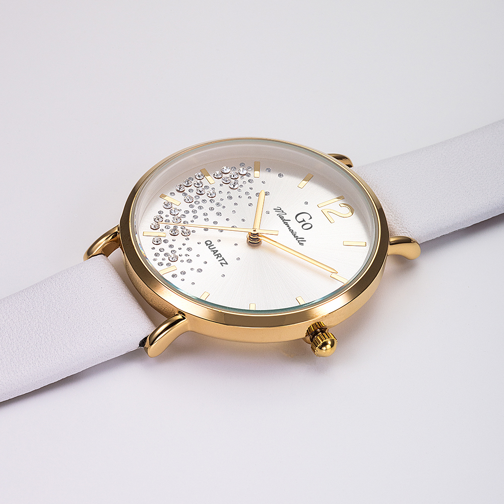 Notre montre Go Mademoiselle 699359 à la silhouette chic et raffinée est un must have ! Son boîtier de 36 mm de diamètre affiche un joli arrondi et s’habille d’un lumineux éclat doré, tout comme ses index et ses fines aiguilles qui indiquent l’heure avec clarté. Balayé par de subtils reflets soleillés, son cadran de couleur argentée est délicatement décoré de petites pierres qui apportent une note de féminité et de lumière à son ensemble. Pour enlacer votre poignet avec élégance, le bracelet de notre montre Go Mademoiselle699359 de la collection G-24h est conçu en cuir d’un blanc lumineux !