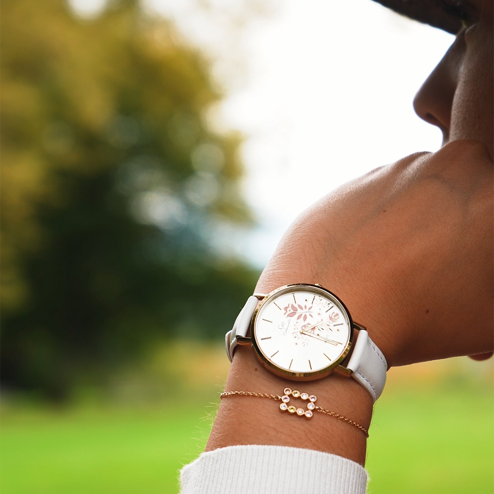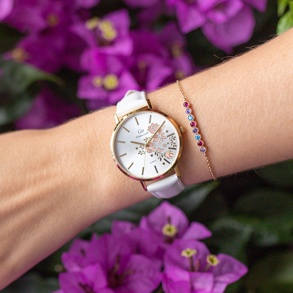 Un brin de candeur et un soupçon d’audace pour cette ravissante création 699575 de notre collection de montres GO Mademoiselle FLEURS ET PAPILLONS. Elle saura vous émerveiller par la beauté naturelle de son cadran Blanc argenté orné de ravissants motifs. Elle est l’accord délicat entre un boitier aux courbes équilibrées en Métal-Doré et un magnifique bracelet Blanc.