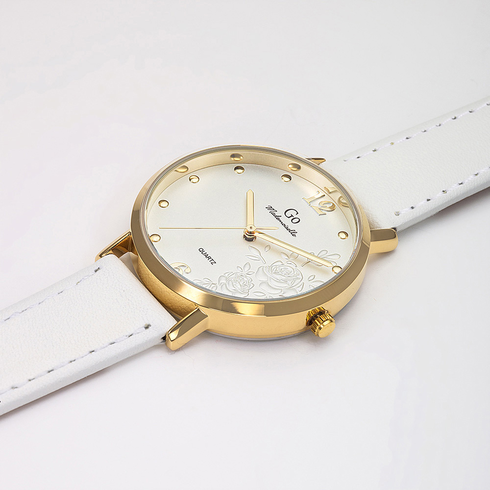 Un brin de candeur et un soupçon d’audace pour cette ravissante création 699600 de notre collection de montres GO Mademoiselle FLEURS ET PAPILLONS. Elle saura vous émerveiller par la beauté naturelle de son cadran Blanc orné de ravissants motifs. Elle est l’accord délicat entre un boitier aux courbes équilibrées en Métal-Doré et un magnifique bracelet Blanc.