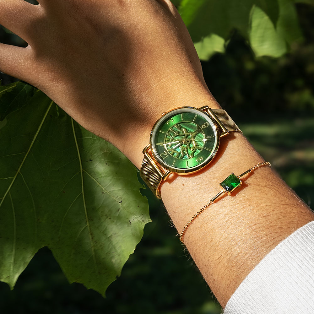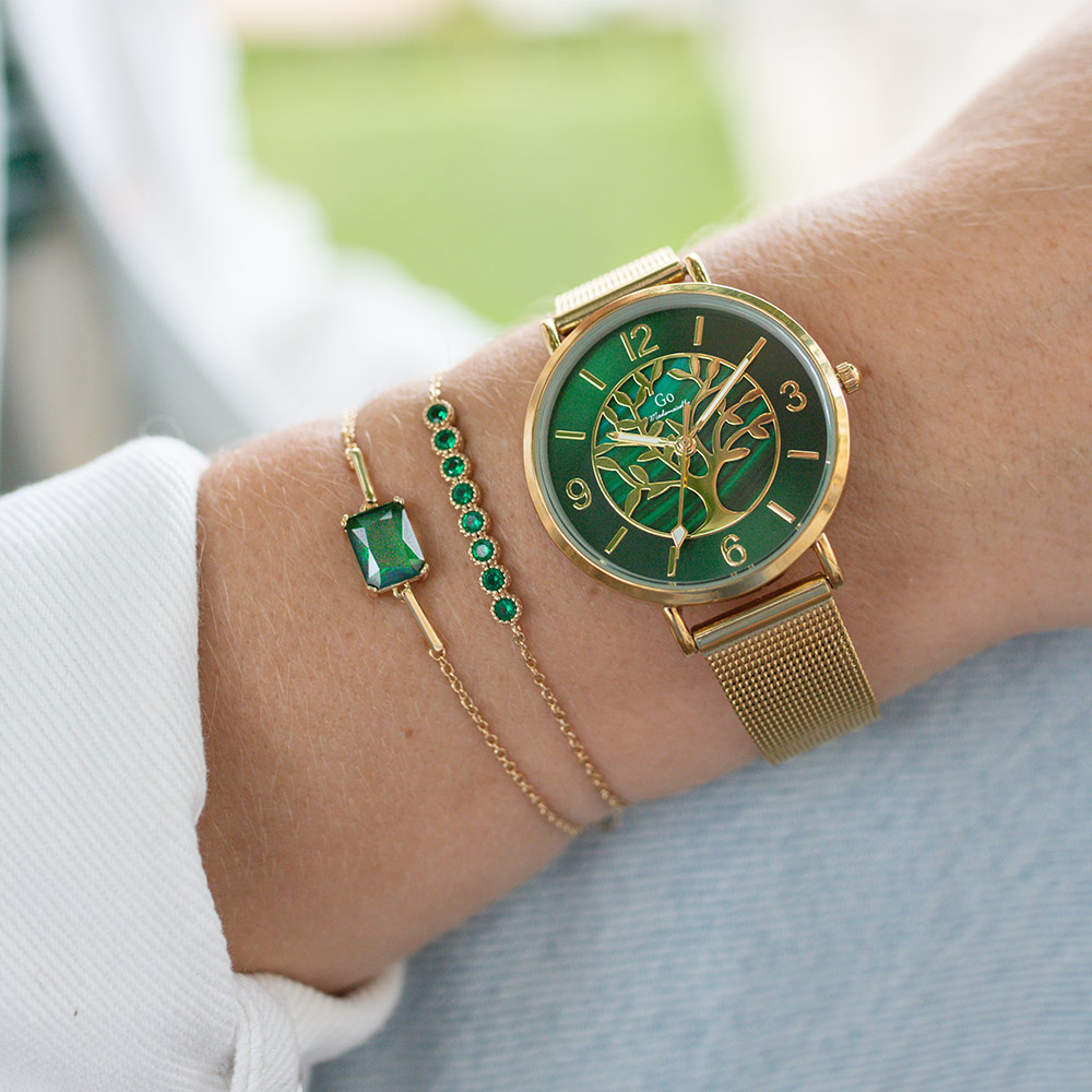 Cette élégante création 695539 de notre collection de montres GO Mademoiselle ARBRE DE VIE s’inspire des essences et des charmes de la nature. Elle saura vous accompagner dans tous vos précieux moments. Faites une pause… et admirez son cadran Vert foncé délicatement ciselé de ce symbole universel de protection, de sagesse et d’éternité. Ce mariage harmonieux entre un boitier aux douces courbes et un délicat bracelet Doré vous fera succomber !