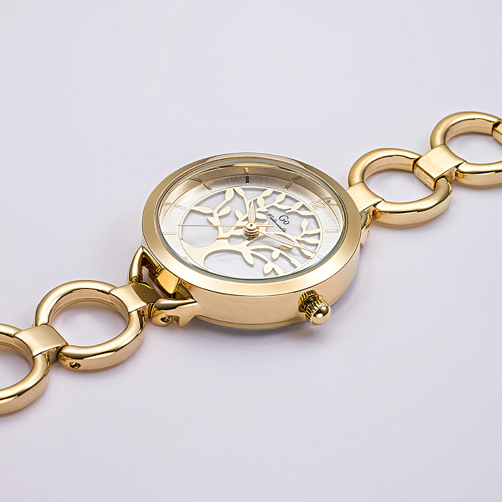 Cette élégante création 695556 de notre collection de montres GO Mademoiselle ARBRE DE VIE s’inspire des essences et des charmes de la nature. Elle saura vous accompagner dans tous vos précieux moments. Faites une pause… et admirez son cadran Argenté & nacré délicatement ciselé de ce symbole universel de protection, de sagesse et d’éternité. Ce mariage harmonieux entre un boitier aux douces courbes et un délicat bracelet Doré vous fera succomber !