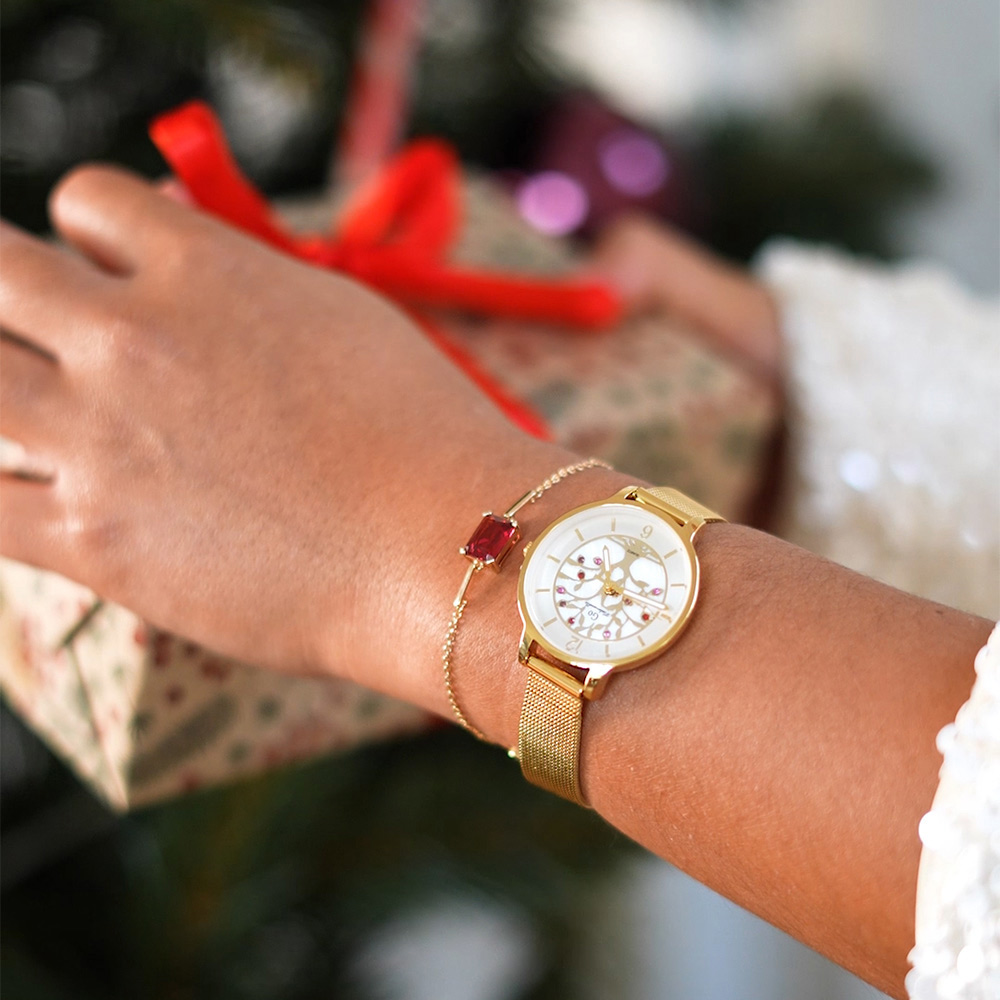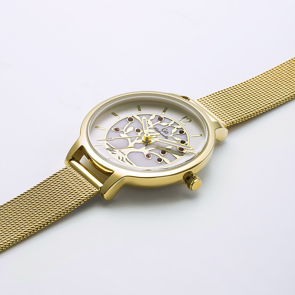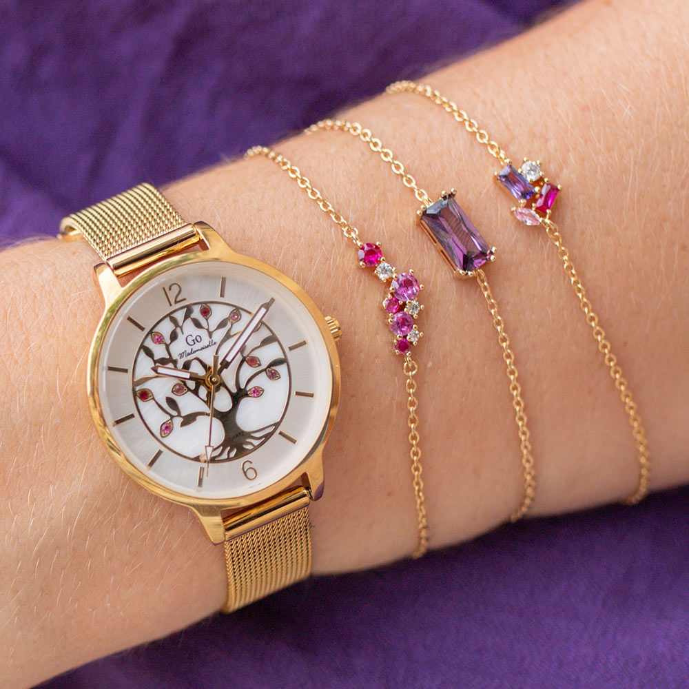 Cette élégante création 695570 de notre collection de montres GO Mademoiselle ARBRE DE VIE s’inspire des essences et des charmes de la nature. Elle saura vous accompagner dans tous vos précieux moments. Faites une pause… et admirez son cadran Argenté & nacré délicatement ciselé de ce symbole universel de protection, de sagesse et d’éternité. Ce mariage harmonieux entre un boitier aux douces courbes et un délicat bracelet Doré vous fera succomber !