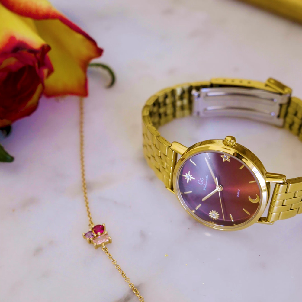 Cette création originale 695647 de notre collection de montres GO Mademoiselle ECLATS D’ETOILES est une invitation à contempler les constellations. Son ravissant cadran Violet moyen est saupoudré d’une pluie d’étoiles. L’alliance entre un boitier aux courbes parfaites et un délicat bracelet Doré font de ce modèle un choix divin.