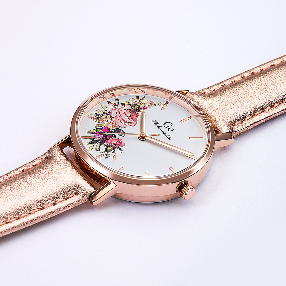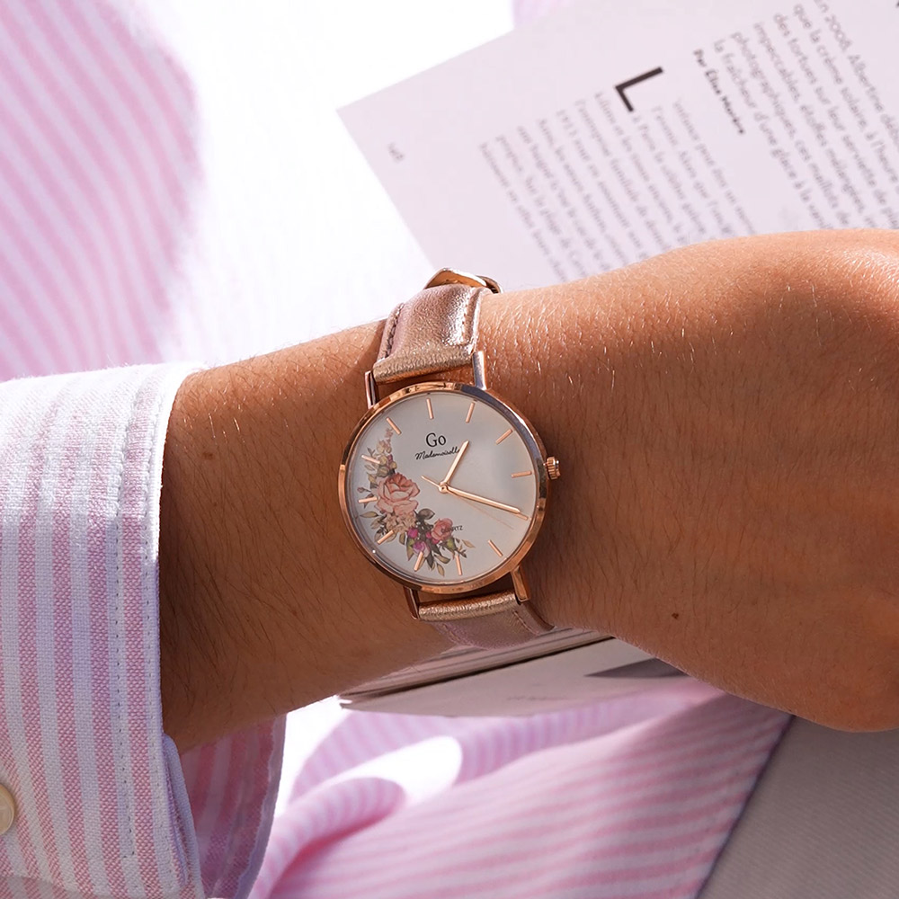 Un brin de candeur et un soupçon d’audace pour cette ravissante création 699594 de notre collection de montres GO Mademoiselle FLEURS ET PAPILLONS. Elle saura vous émerveiller par la beauté naturelle de son cadran Blanc orné de ravissants motifs. Elle est l’accord délicat entre un boitier aux courbes équilibrées en Métal-Doré rose et un magnifique bracelet Doré rose.