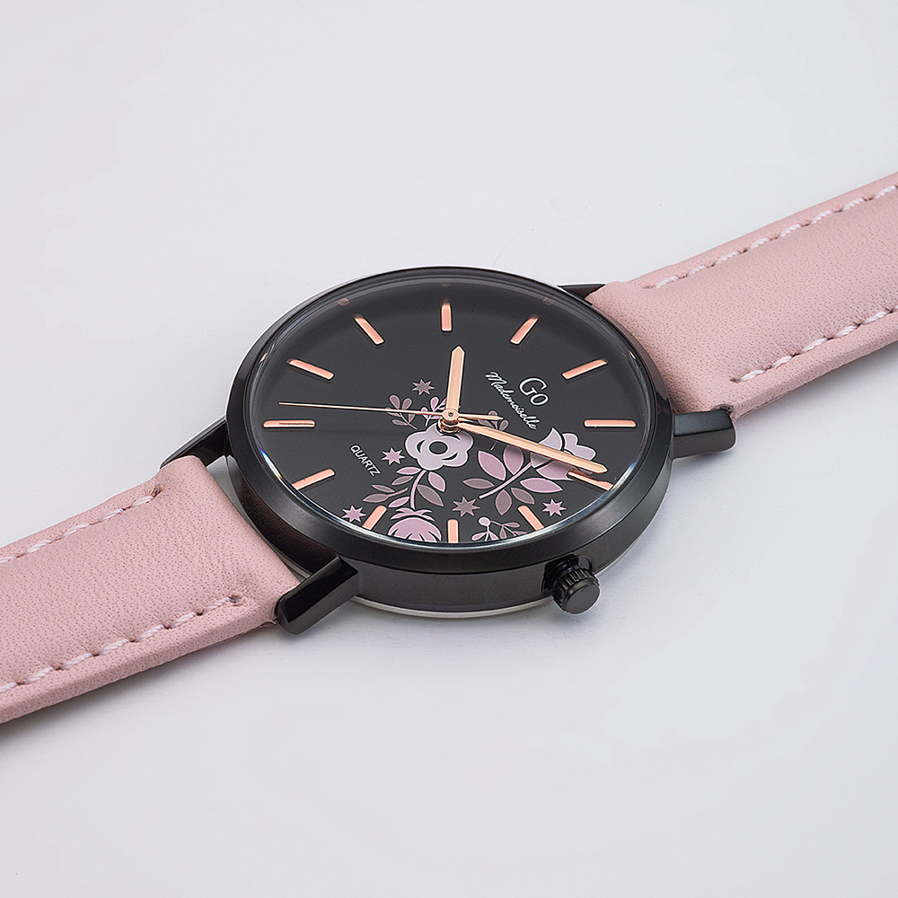 Notre jolie montre Go Mademoiselle 699009 se veut tendance et colorée pour égayer toutes vos tenues ! Elle arbore un petit boîtier noir et rond de 34 mm de diamètre qui abrite un joli cadran assorti. Les ravissantes fleurs roses et parme qui décorent ce dernier apportent une note supplémentaire de féminité à notre modèle. Pour lire l’heure avec clarté et précision, vous pouvez compter sur son trio d’aiguilles et ses index rose gold. Le bracelet en cuir rose pastel de notre montre Go Mademoiselle 699009 vous accompagnera auquotidien avec gaieté !