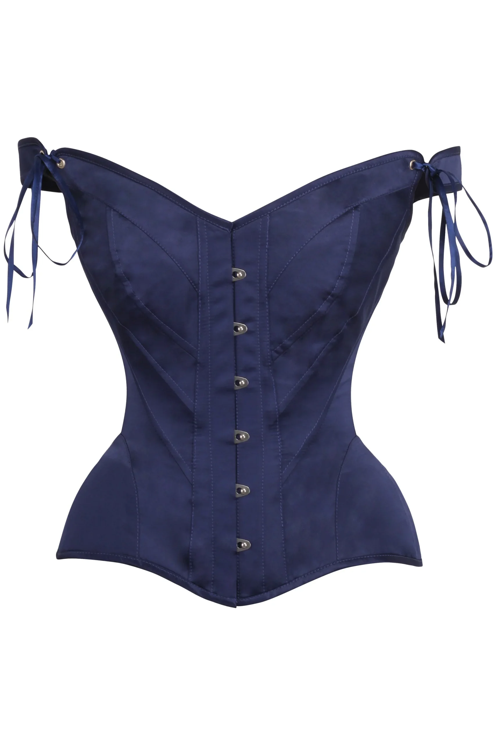 As luxurious as its namesake with its sleek satin finish and exquisite detailing. With an elegantly shaped front and sculpted hip panels, the flattering navy blue overbust bodice is perfect for outerwear and is certain to make a bold style statement. With an off the shoulder style, the corset has a ribbon back lacing for the perfect custom fit, with the smooth satin fabric giving you a streamlined silhouette. Dainty ribbons at the shoulders help to make this piece a classy addition to any corset collection.
