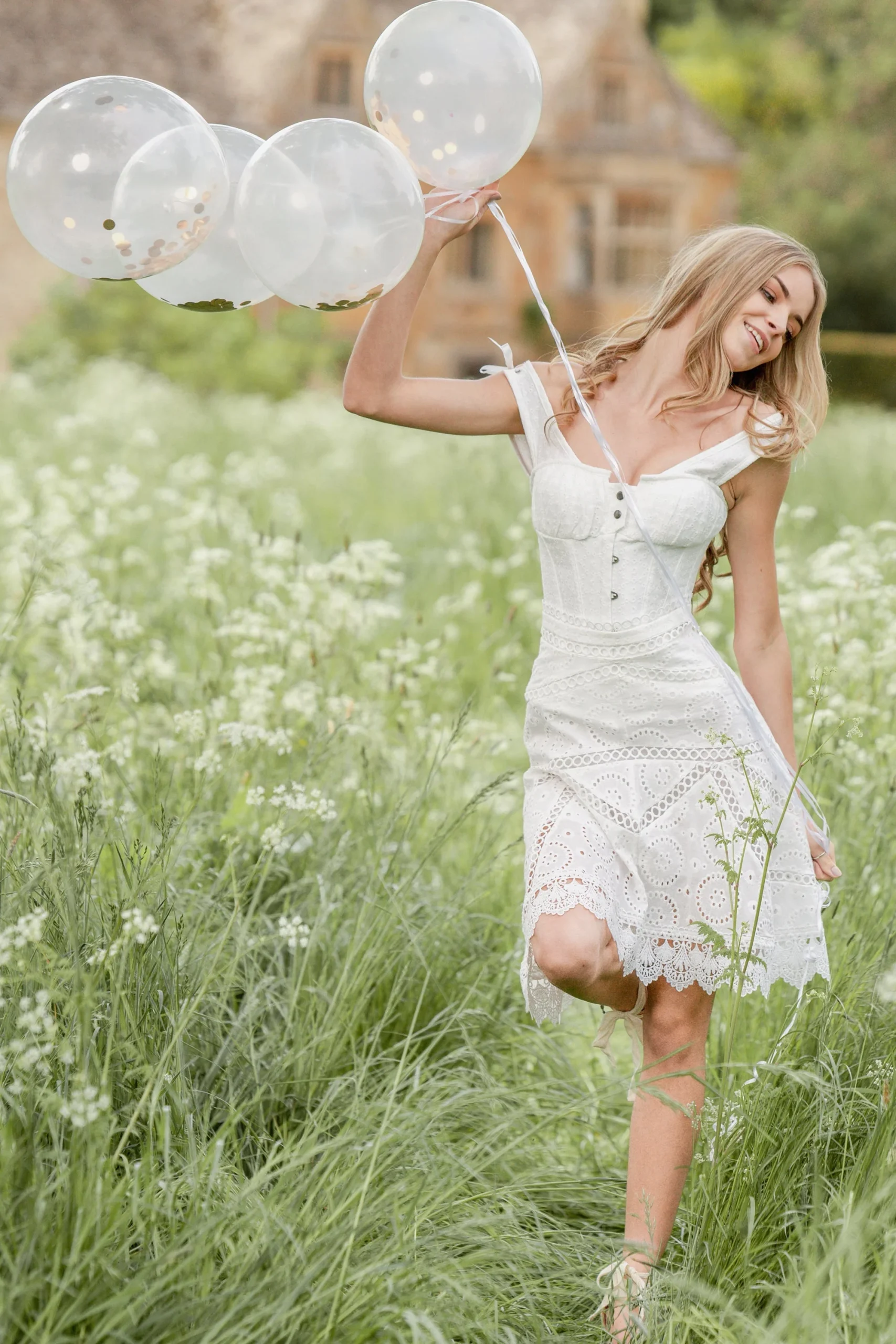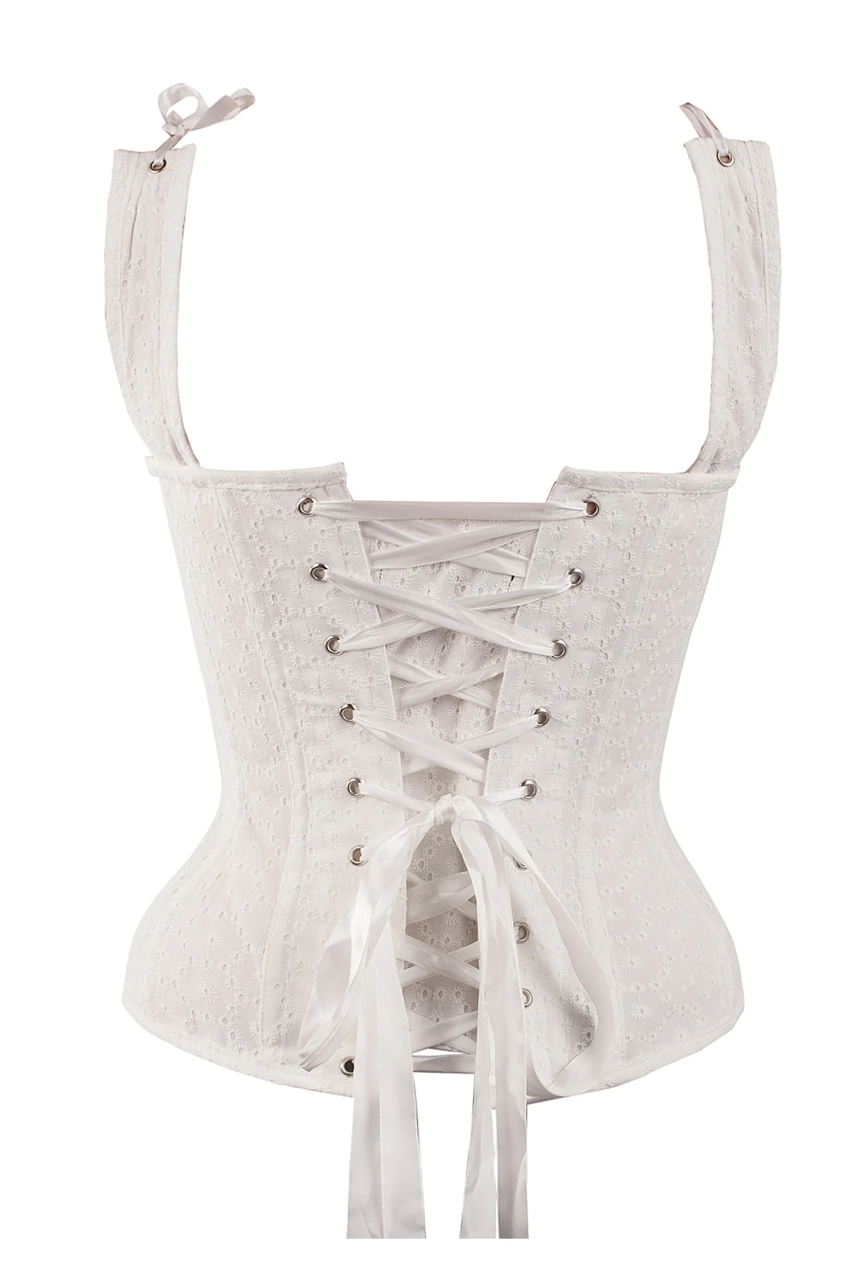 - Caractéristiques de la conception du corset : tissu broderie anglaise, buste froncé avec bouton-pression, sangles ajustables à ruban