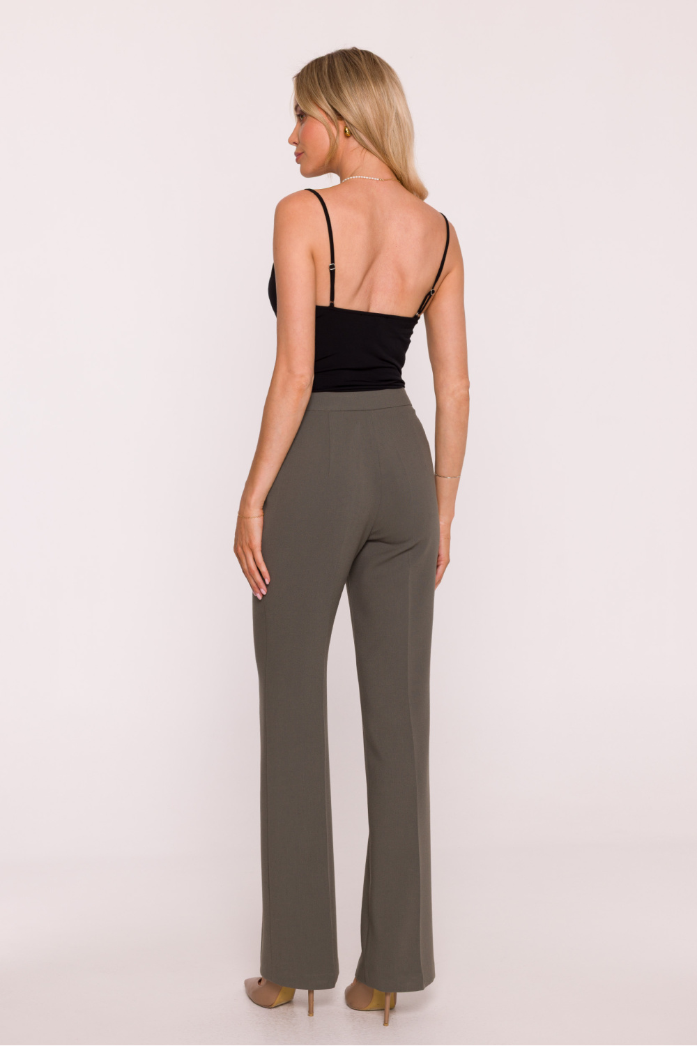Pantalon classique pour femme fabriqué dans un tissu lisse à la finition douce. Coupe de costume, ajustée à la taille et aux hanches, avec des jambes longues et droites pressées sur le côté, qui affinent la silhouette et ajoutent de l’élégance. Le modèle a une taille moyenne et des poches latérales pratiques. La fermeture à l’avant par un bouton et une fermeture éclair cachée garantit confort et finition esthétique. L’absence de doublure rend les pantalons légers et confortables à porter. La coupe intemporelle convient aussi bien aux tenues de bureau qu’aux ensembles plus formels. Conçu et fabriqué en Pologne.