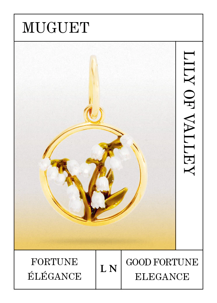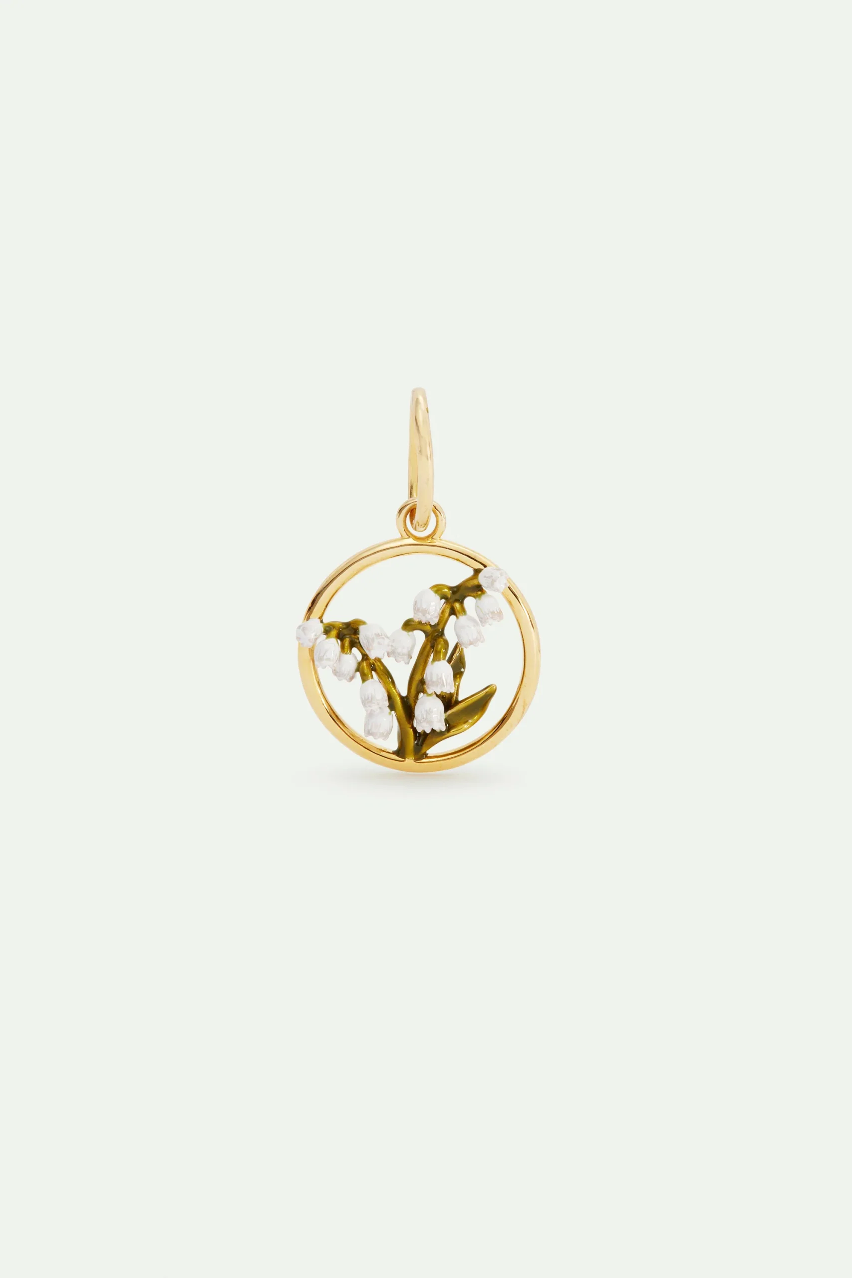 Pendentif brin de muguet peint à la main vert et blanc, encerclé d’un anneau en laiton doré. À accrocher, seul ou en accumulation, à l’un de nos supports vendus séparément. Créez un bijou unique et portez vos symboles comme des porte-bonheurs, pour une composition à votre image.