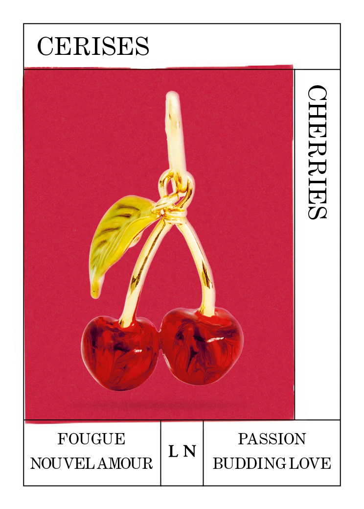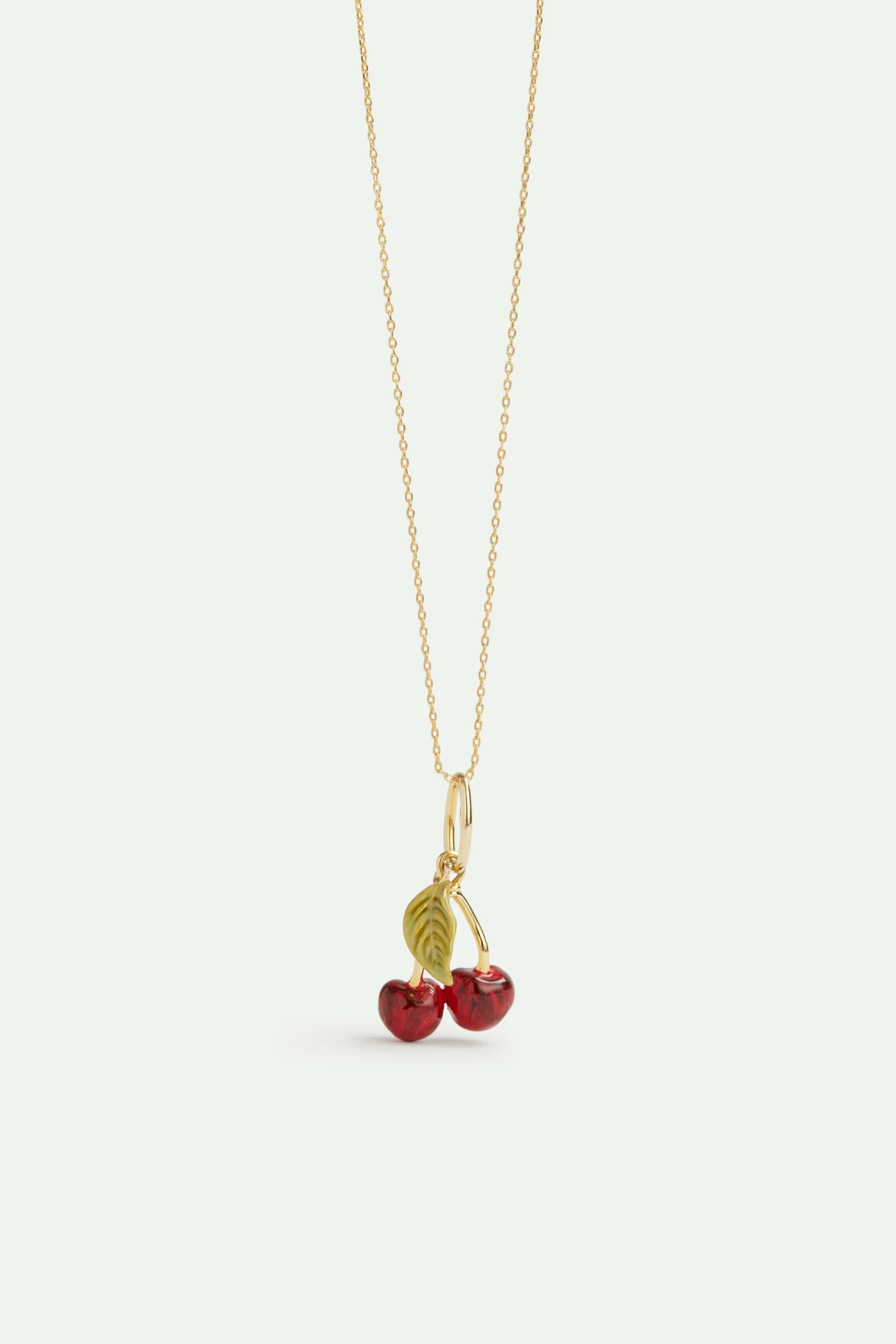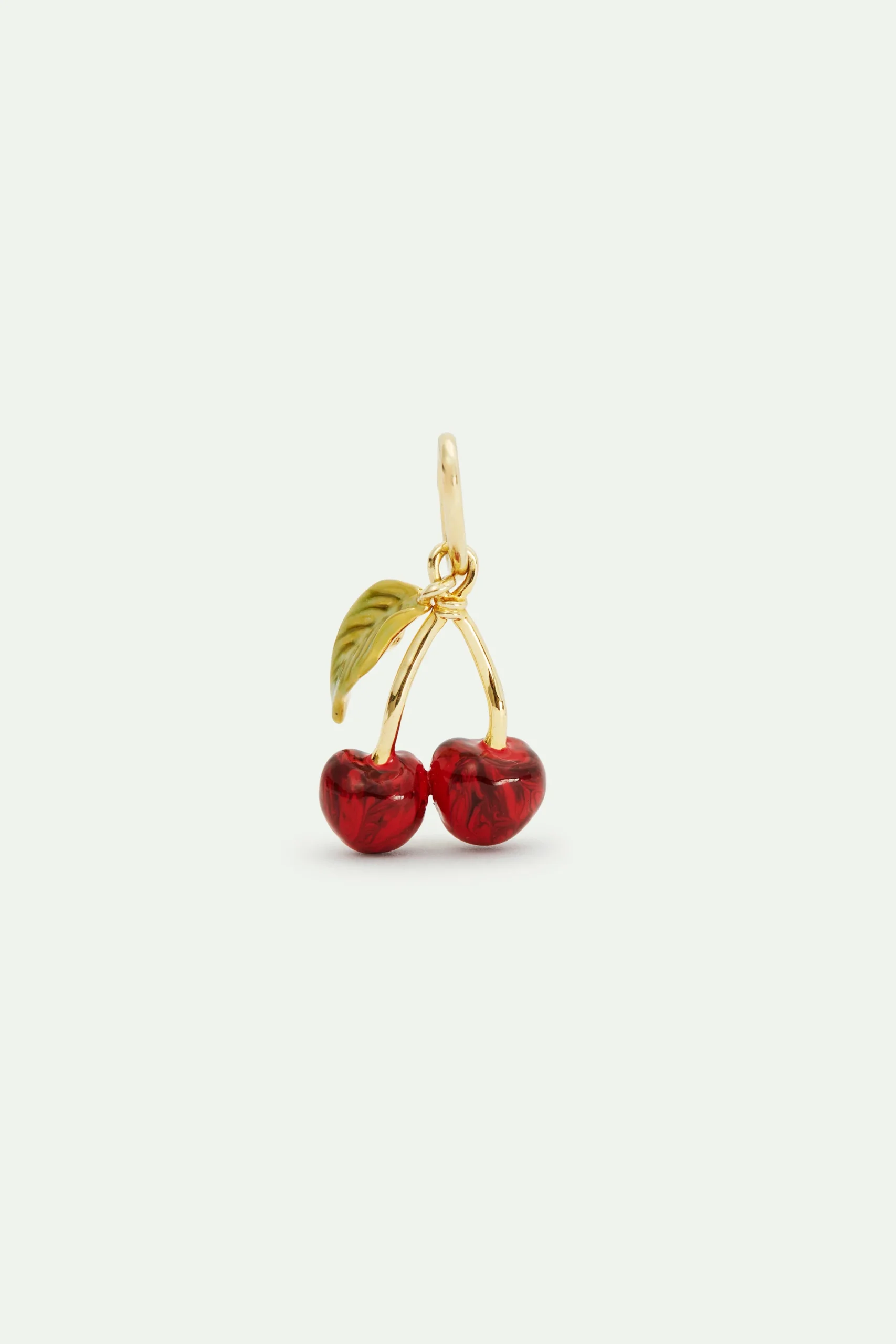 Pendentif paire de cerises peint à la mains dans des nuances de rouge, tiges en laiton doré. À accrocher, seul ou en accumulation, à l’un de nos supports vendus séparément. Créez un bijou unique et portez vos symboles comme des porte-bonheurs, pour une composition à votre image.