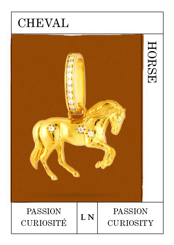 Pendentif cheval en laiton doré à l’or fin, bnélière ornée d’oxydes de zirconium