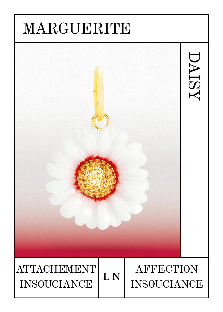 Pendentif marguerite, pétales blancs et roses peints à la main, pistil de fleur en laiton doré et cristaux. À accrocher, seul ou en accumulation, à l’un de nos supports vendus séparément. Créez un bijou unique et portez vos symboles comme des porte-bonheurs, pour une composition à votre image.